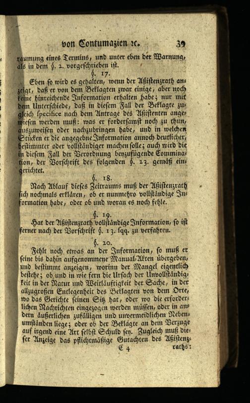 Fehlt noch etwas an der Information, so muß er feine bis dahin aufgenommene Manual Akten übergeben, und bestimmt anzeigen, worinn der Mangel eigentlich bestehe; ob und in wie fern die Ursach der Unvollständig feit in der Natur und Weitläuftigkeit der Sache, in der allzugroßen Entlegenheit des Beklagten von dem Orte, wo das Gerichte seinen Siz hat, oder wo die erforder= lichen Nachrichten eingezogen werden müssen, oder in ans dern äußerlichen zufälligen und unvermeidlichen Neben. umständen liege; oder ob der Beklagte an dem Verzuge auf irgend eine Art selbst Schuld sey. Zugleich muß dies fer Anzeige das pflichtmäßige Gutachten des Aßistenz