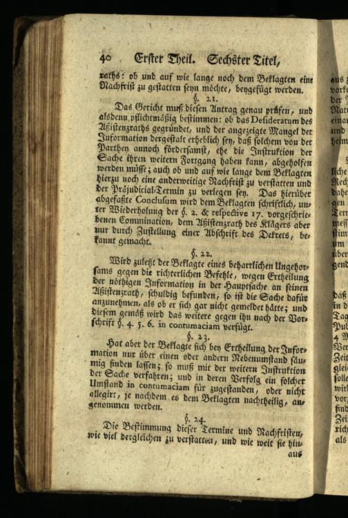Wird zuleßt der Beklagte eines beharrlichen Ungehors fams gegen die richterlichen Befehle, wegen Ertheilung der nöthigen Information in der Hauptsache an seinen Aßistenzrath, schuldig befunden, so ist die Sache dafür anzunehmen, als ob er sich gar nicht gemeldet hätte; und diefem gemäß wird das weitere gegen ihn nach der Vors fchrift§. 4. 5. 6. in contumaciam verfügt.