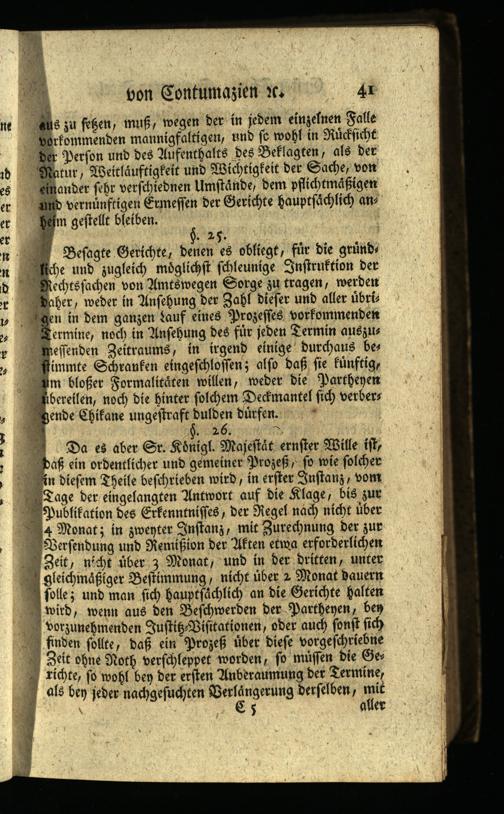 Da es aber Sr. Königl. Majestát ernster Wille ist, Daß ein ordentlicher und gemeiner Prozeß, so wie solcher in diesem Theile beschrieben wird, in erster Instanz, vom Tage der eingelangten Antwort auf die Klage, bis zur Publikation des Erkenntnisses, der Regel nach nicht über 4 Monat; in zweyter Instanz, mit Zurechnung der zur Versendung und Remißion der Akten etwa erforderlichen Zeit, nicht über 3 Monat, und in der dritten, unter gleichmäßiger Bestimmung, nicht über 2 Monat dauern folle; und man fich hauptsächlich an die Gerichte halten wird, wenn aus den Beschwerden der Partheyen, ben vorzunehmenden Justiz Visitationen, oder auch sonst sich finden sollte, daß ein Prozeß über diese vorgeschriebne Zeit ohne Noth verschleppet worden, so müssen die Gerichte, so wohl bey der ersten Anberaumung der Termine, als ben jeder nachgesuchten Verlängerung derselben, mit aller