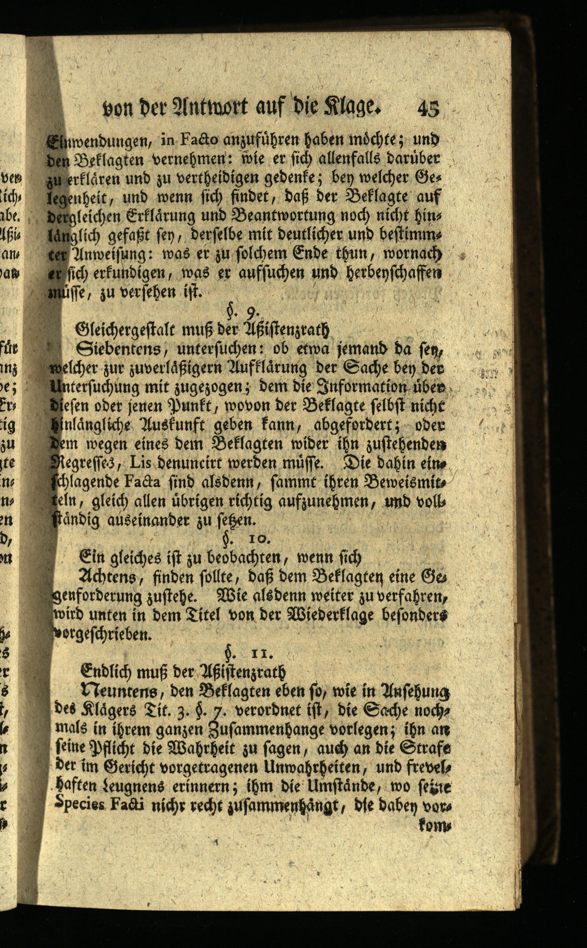 Siebentens, untersuchen: ob etwa jemand da sen, welcher zur zuverläßigern Aufklärung der Sache bey der Untersuchung mit zugezogen; dem die Information über diesen oder jenen Punkt, wovon der Beklagte selbst niche hinlängliche Auskunft geben kann, abgefordert; oder dem wegen eines dem Beklagten wider ihn zustehenden Regresses, Lis denuncirt werden müsse. Die dahin eine schlagende Facta find alsdenn, sammt ihren Beweismit teln, gleich allen übrigen richtig aufzunehmen, und voll ständig auseinander zu sehen. §. 10.
