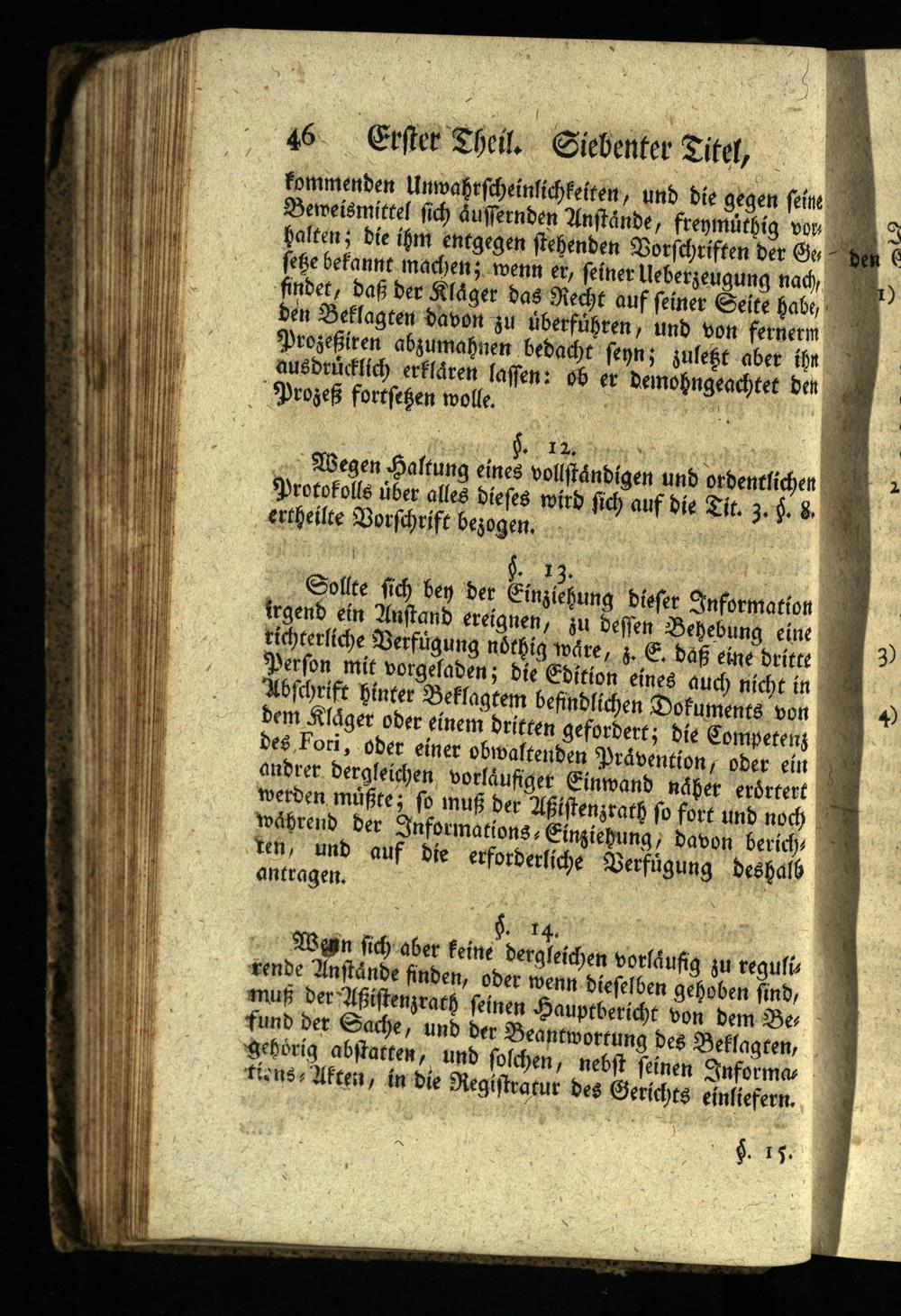 46 kommenden Unwahrscheinlichkeiten, und die gegen seine Beweismittel fich aussernden Anstände, freymuthig vor halten; die ihm entgegen stehenden Vorschriften der Ges feße bekannt machen; wenn er, seiner Ueberzeugung nach findet, daß der Kläger das Recht auf seiner Seite habe, den Beklagten davon zu überführen, und von fernerm Prozeßiren abzumahnen bedacht seyn; zuleßt aber ihn ausdrücklich erklären lassen: ob er demohngeachtet den Prozeß fortseßen wolle.