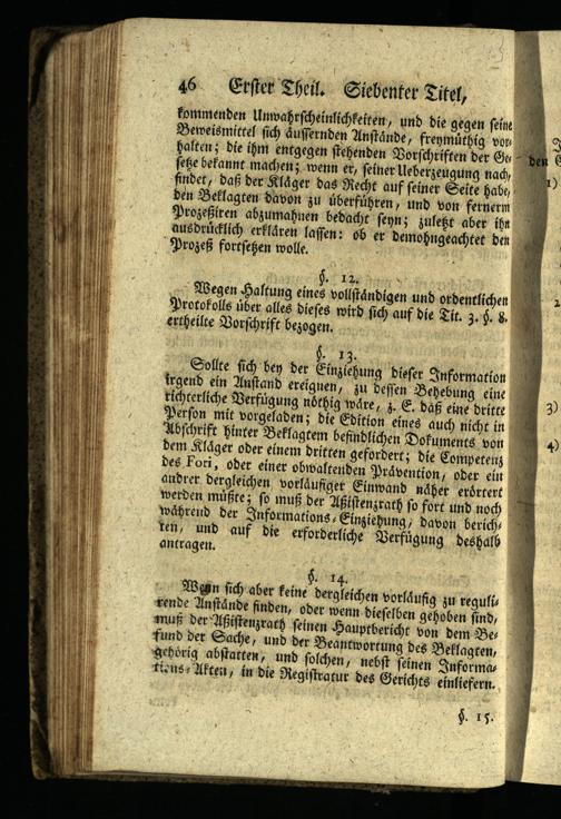 Sollte sich ben der Einziehung dieser Information irgend ein Anstand ereignen, zu dessen Behebung eine richterliche Verfügung nöthig wäre,&. E. daß eine dritte Person mit vorgeladen; die Edition eines auch nicht in Abschrift hinter Beklagtem befindlichen Dokuments von dem Kläger oder einem dritten gefordert; die Competenz des Fori, oder einer obwaltenden Prävention, oder ein andrer dergleichen vorläufiger Einwand näher erörtert werden müßte; so muß der Asistenzrath so fort und noch während der Informations. Einziehung, davon berich ten, und auf die erforderliche Verfügung deshalb antragen.