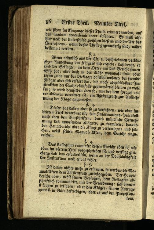 Dieser hat daben eben so zu verfahren, wie oben im dritten Titel verordnet ist; sein Informations Protokoll nach eben den Vorschriften, durch mündliche Verneh mung des anwesenden Klägers, zu formiren; daraus den Hauptbericht über die Klage zu verfertigen; und sol chen, nebst seinen Manual, Aften, dem Gericht einzu reichen.