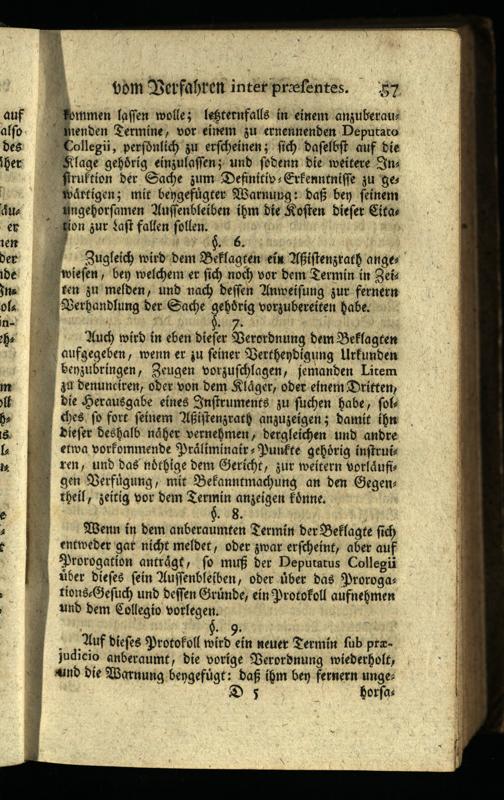 Auch wird in eben dieser Verordnung dem Beklagten aufgegeben, wenn er zu feiner Vertheydigung Urkunden benzubringen, Zeugen vorzuschlagen, jemanden Litem zu denunciren, oder von dem Kläger, oder einem Dritten, die Herausgabe eines Instruments zu suchen habe, sol ches so fort seinem Aßistenzrath anzuzeigen; damit ihn Dieser deshalb näher vernehmen, dergleichen und andre etwa vorkommende Práliminair- Punkte gehörig instruis ren, und das nöthige dem Gericht, zur weitern vorläufi gen Verfügung, mit Bekanntmachung an den Gegen theil, zeitig vor dem Termin anzeigen könne.