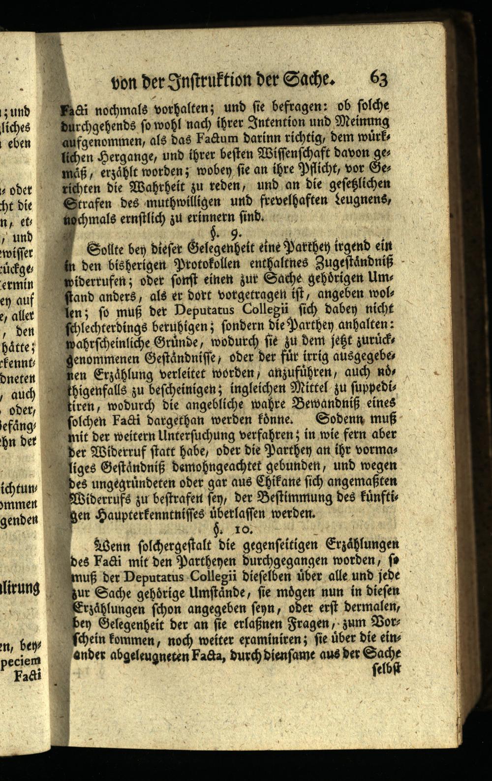 Sollte ben dieser Gelegenheit eine Parthey irgend ein in den bisherigen Protokollen enthaltnes Zugeständniß widerrufen; oder sonst einen zur Sache gehörigen Um stand anders, als er dort vorgetragen ist, angeben wollen; so muß der Deputatus Collegü sich daben nicht schlechterdings beruhigen; sondern die Parthey anhalten: wahrscheinliche Gründe, wodurch sie zu dem jest zurück genommenen Geständnisse, oder der für irrig ausgegebe nen Erzählung verleitet worden, anzuführen, auch no thigenfalls zu bescheinigen; ingleichen Mittel zu fuppedi tiren, wodurch die angebliche wahre Bewandniß eines solchen Facti dargethan werden könne. Sodenn muß mit der weitern Untersuchung verfahren; in wie fern aber der Widerruf statt habe, oder die Parthen an ihr vormas liges Geständniß demohngeachtet gebunden, und wegen des ungegründeten oder gar aus Chikane sich angemaßten Widerrufs zu bestrafen sey, der Bestimmung des künfti gen Haupterkenntnisses überlassen werden.