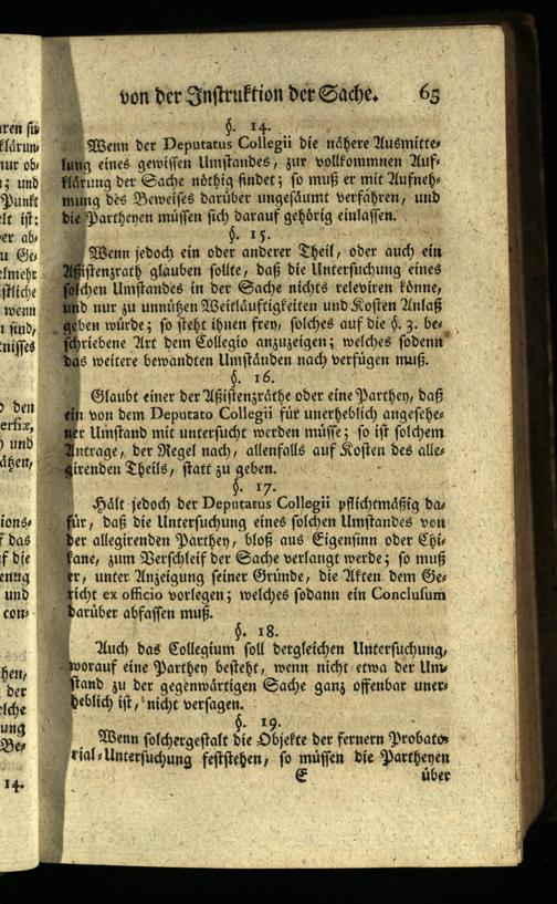 Wenn jedoch ein oder anderer Theil, oder auch ein Asistenzrath glauben sollte, daß die Untersuchung eines solchen Umstandes in der Sache nichts releviren könne, und nur zu unnüßen Weitläuftigkeiten und Kosten Anlaß geben würde; so steht ihnen fren, solches auf die§. 3. bes schriebene Art dem Collegio anzuzeigen; welches sodenn das weitere bewandten Umständen nach verfügen muß. §. 16.