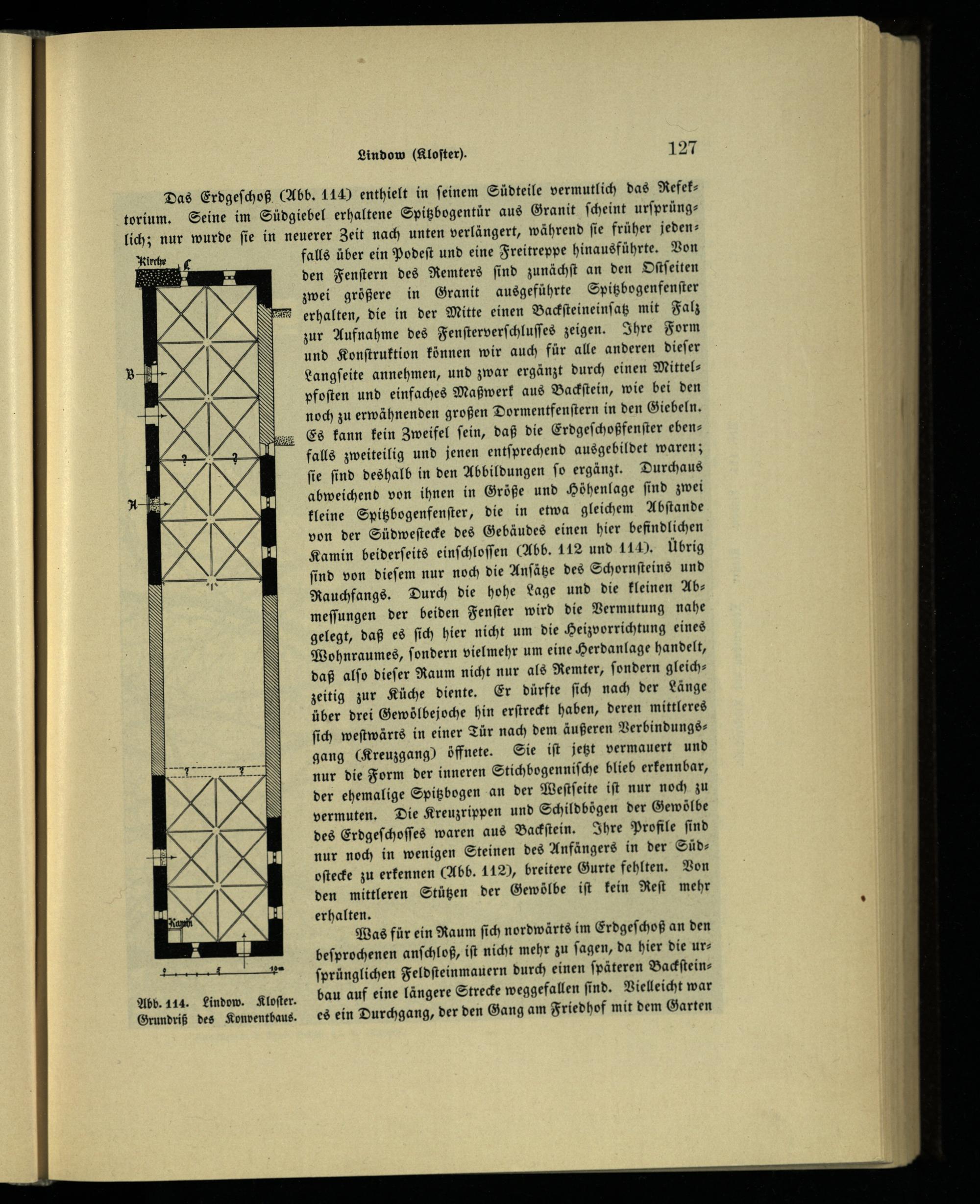 Das Erdgeſchoß(Abb. 114) enthielt in ſeinem Südteile vermutlich das Refektorium. Seine im Südgiebel erhaltene Spitzbogentür aus Granit ſcheint urſprünglich; nur wurde ſie in neuerer Zeit nach unten verlängert, während ſie früher jeden