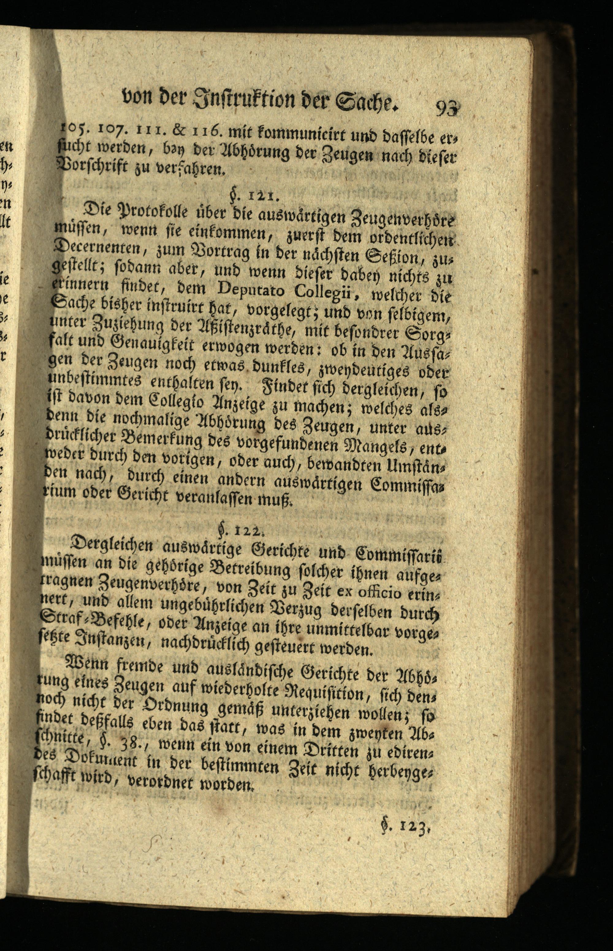 Die Protokolle über die auswärtigen Zeugenverhdre müssen, wenn sie einkommen, zuerst dem ordentlichen Decernenten, zum Vortrag in der nächsten Seßion, zus gestellt; sodann aber, und wenn dieser dabey nichts zu erinnern findet, dem Deputato Collegii, welcher die Sache bisher instruirt hat, vorgelegt; und von selbigem, unter Zuziehung der Asistenzråthe, mit besondrer Sorgs falt und Genauigkeit erwogen werden: ob in den Aussa gen der Zeugen noch etwas, dunkles, zweydeutiges oder unbestimmtes enthalten sey. Findet sich dergleichen, so ist davon dem Collegio Anzeige zu machen; welches also denn die nochmalige Abhörung des Zeugen, unter aus drücklicher Bemerkung des vorgefundenen Mangels, ente weder durch den vorigen, oder auch, bewandten Umstan den nach, durch einen andern auswärtigen Commiffas rium oder Gericht veranlassen muß.