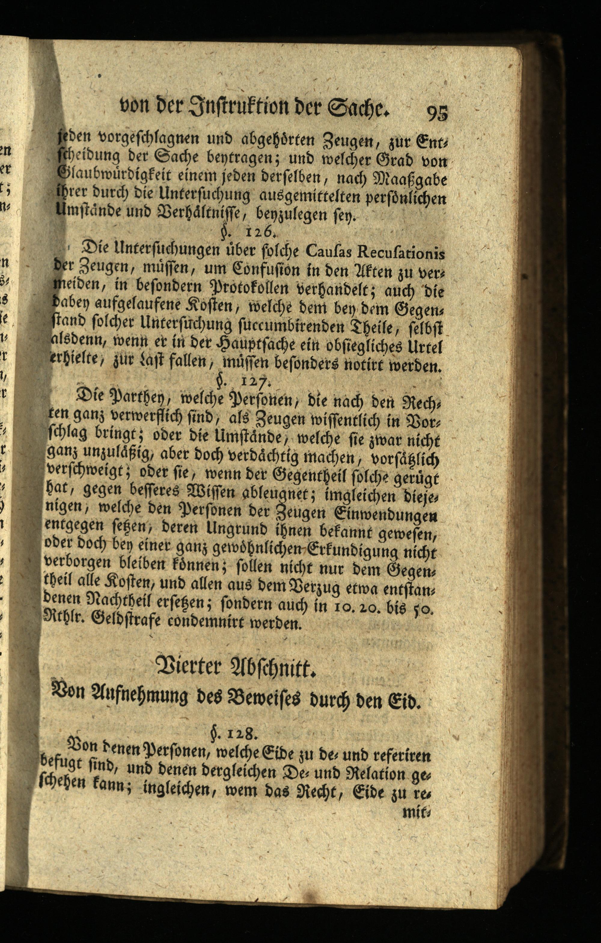Die Untersuchungen über solche Caufas Recufationis der Zeugen, müssen, um Confusion in den Akten zu vers meiden, in besondern Protokollen verhandelt; auch die daben aufgelaufene Kosten, welche dem bey dem Gegens stand solcher Untersuchung succumbirenden Theile, selbst alsdenn, wenn er in der Hauptsache ein obfiegliches Urtel erhielte, zur last fallen, müssen besonders notirt werden. §. 127.