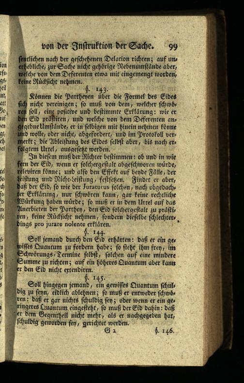 Soll hingegen jemand, ein gewisses Quantum schul dig zu seyn, eidlich ablehnen; so muß er entweder schwds ren: daß er gar nichts schuldig sen; oder wenn er ein ges ringeres Quantum eingesteht, so muß der Eid dahin: daß er dem Gegentheil nicht mehr, als er nachgegeben hat, schuldig geworden fen, gerichtet werden.