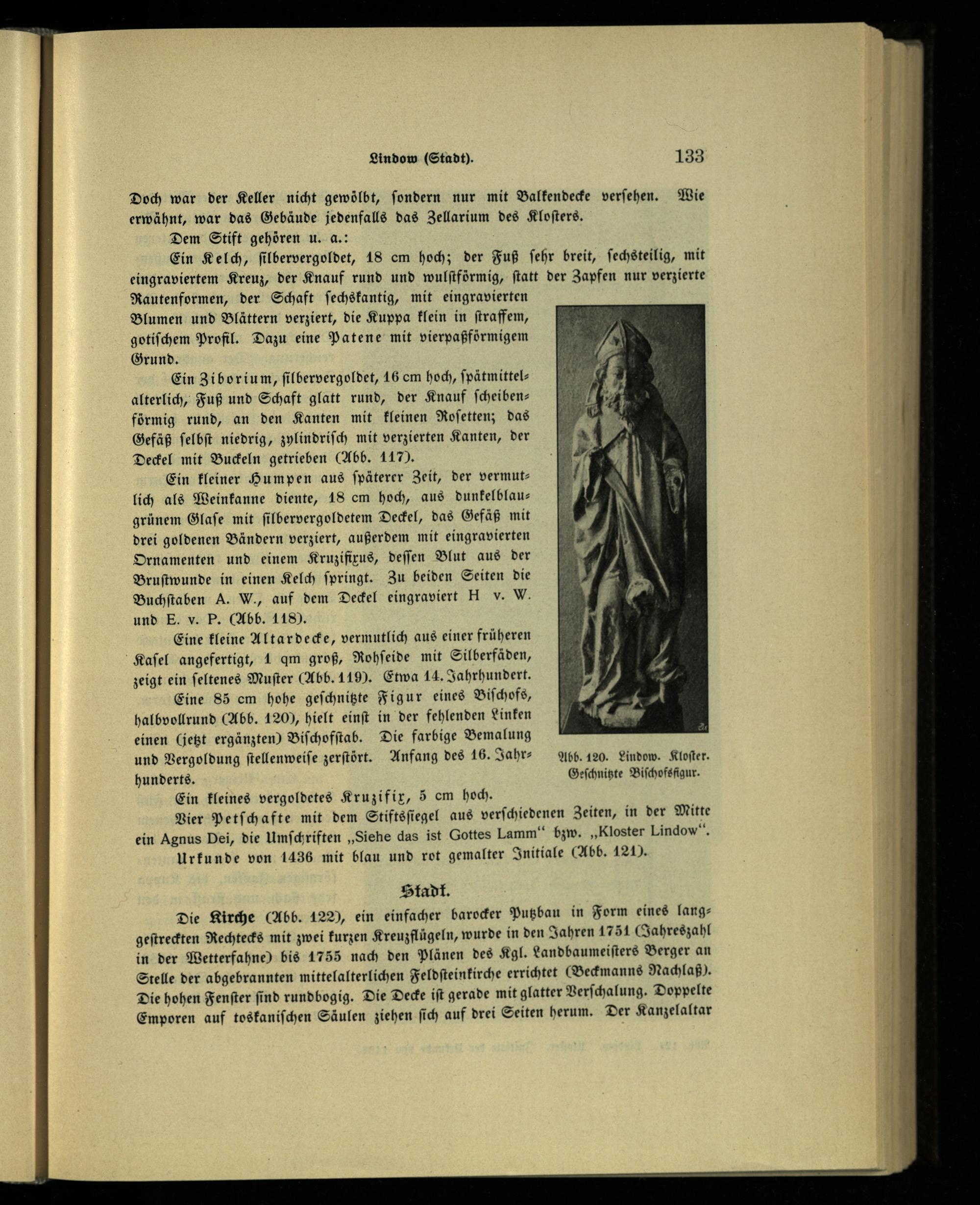 Eine 85 em hohe geſchnitzte Figur eines Biſchofs, halbvollrund(Abb. 120), hielt einſt in der fehlenden Linken einen(jetzt ergänzten) Biſchofſtab . Die farbige Bemalung und Vergoldung ſtellenweiſe zerſtört. Anfang des 146. Jahr⸗ Abb. 120. Lindow. Kloſter. hunderts. Geſchnitzte Biſchofsfigur.