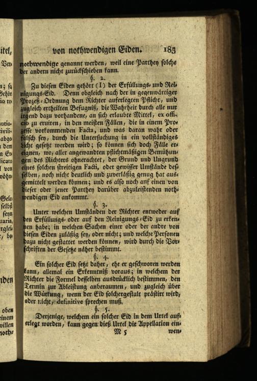 Zu diesen Eiden gehört( I) der Erfüllungs, und Reis nigungs- Eid. Denn obgleich nach der in gegenwärtiger Prozeß Ordnung dem Richter auferlegten Pflicht, und zugleich ertheilten Befugniß, die Wahrheit durch alle nur irgend dazu vorhandene, an sich erlaubte Mittel, ex officio zu eruiren, in den meisten Fällen, die in einem Pros zeffe vorkommenden Facta, und was daran wahr oder abge falsch sen, durch die Untersuchung in ein vollständiges dem licht gesetzt werden wird; so können sich doch Fälle ers n Er eignen, wo, aller angewandten pflichtmäßigen Bemühun gen des Richters ohnerachtet, der Grund und Ungrund eines solchen streitigen Fachi, oder gewisser Umstände des selben, noch nicht deutlich und zuverläßig genug hat auss gemittelt werden können; und es also noch anf einen von dieser oder jener Parthey darüber abzuleistenden noth wendigen Eid ankommt.