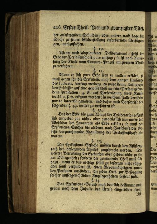 Wenn er sich pure Erbe senn zu wollen erklärt, so muß gegen ihn die Exekution, nach dem ganzen Umfange des Judicati, verfügt werden; es wäre denn, daß gegen den Erblasser auf eine gewisse bloß an seine Person gebun dene Prästation, z. E. auf Berfertigung eines Kunst werks u. s. w. erkannt worden; in welchem Falle der Erbe nur ad intereffe gehalten, und daher nach Vorschrift des folgenden§. 43. weiter zu verfahren ist.