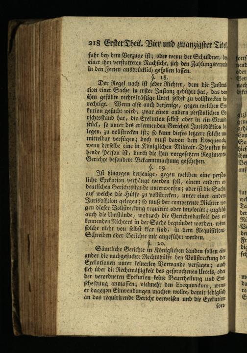 Sämtliche Gerichte in Königlichen Landen sollen ein ander die nachgesuchte Rechtshulfe ben Vollstreckung der Exekutionen unter keinerley Vorwande versagen; auch sich über die Rechtmäßigkeit des gesprochenen Urtels, oder der verordneten Exekution feine Beurtheilung und Ent fcheidung anmaffen; vielmehr den Exequendum, wenn er dagegen Einwendungen machen wollte, damit lediglic an das requirirende Gericht verweisen und die Exekution
