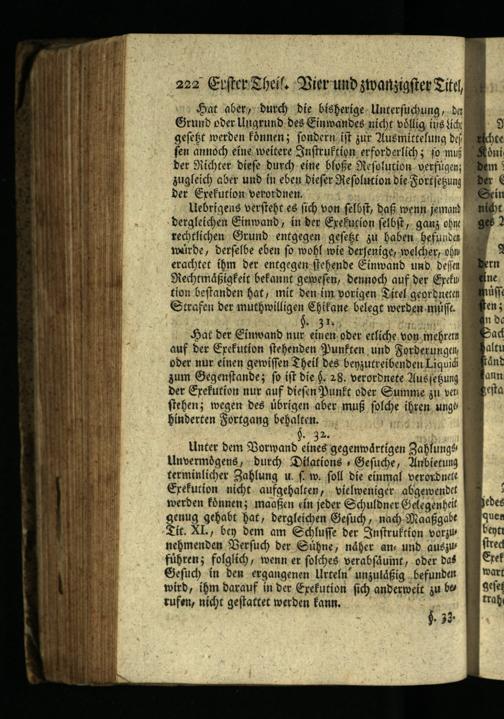 Uebrigens versteht es sich von selbst, daß wenn jemand dergleichen Einwand, in der Exekution selbst, ganz ohne rechtlichen Grund entgegen gefeht zu haben befunden warde, derselbe eben so wohl wie derjenige, welcher, ohn erachtet ihm der entgegen stehende Einwand und dessen Rechtmäßigkeit bekannt gewesen, dennoch auf der Ereku tion bestanden hat, mit den im vorigen Titel geordneten Strafen der muthwilligen Chikane belegt werden müsse. §. 31.