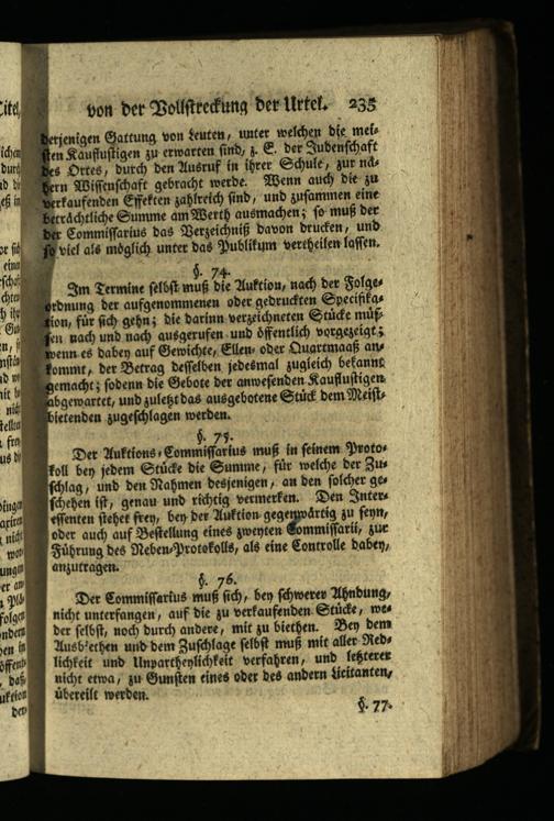 Derjenigen Gattung von Leuten, unter welchen die meis ften Kauflustigen zu erwarten sind, z. E. der Judenschaft des Ortes, durch den Ausruf in ihrer Schule, zur nås hern Wissenschaft gebracht werde. Wenn auch die zu verkaufenden Effekten zahlreich sind, und zusammen eine beträchtliche Summe am Werth ausmachen; so muß der der Commissarius das Verzeichniß davon drucken, und so viel als möglich unter das Publikum vertheilen laffen.