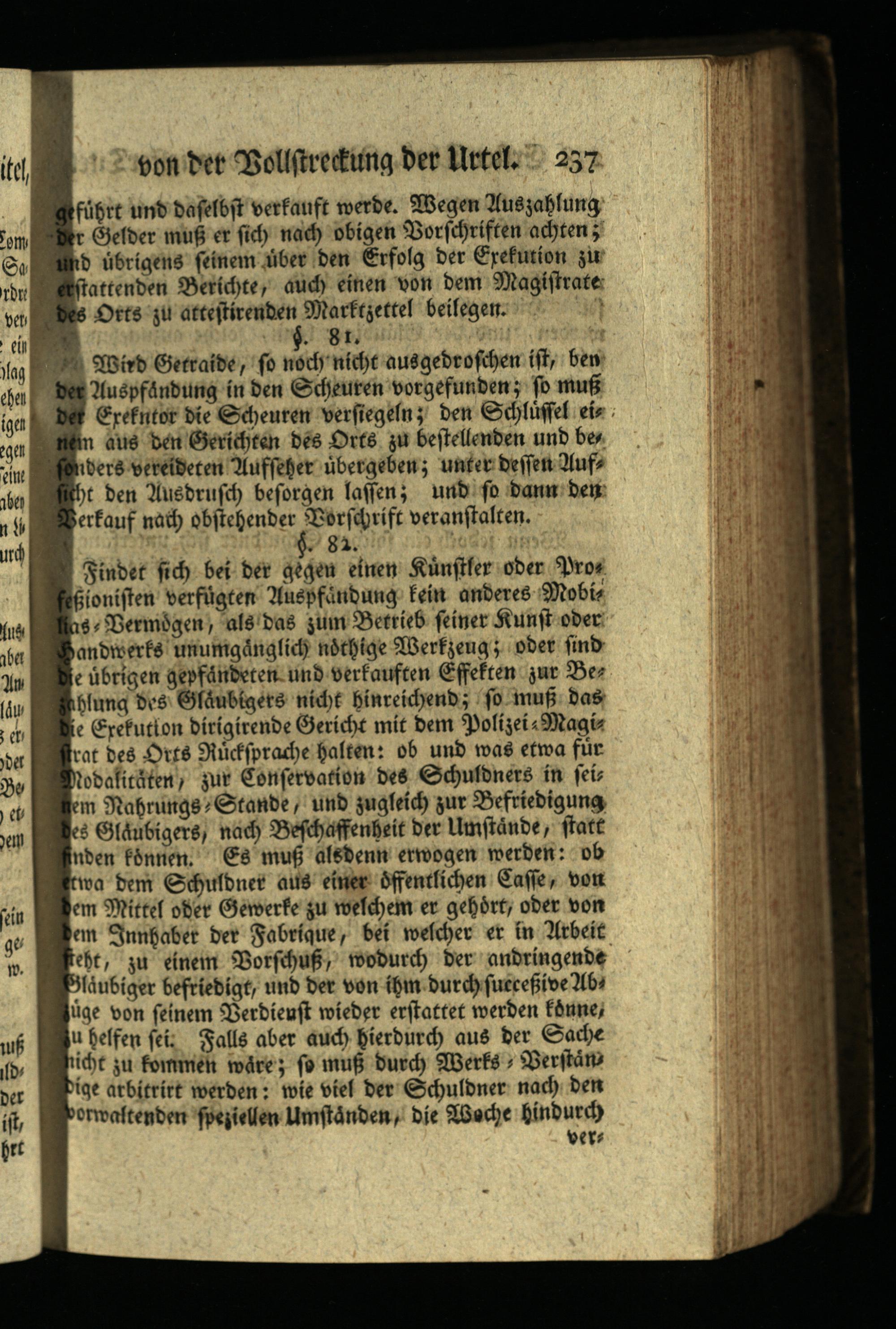 Findet sich bei der gegen einen Künstler oder Pros feßionisten verfügten Auspfändung kein anderes Mobi lias Vermögen, als das zum Betrieb seiner Kunst oder Handwerks unumgänglich ndthige Werkzeug; oder sind Die übrigen gepfändeten und verkauften Effekten zur Bes zahlung des Glaubigers nicht hinreichend; so muß das die Erekution dirigirende Gericht mit dem Polizei Magi strat des Orts Rücksprache halten: ob und was etwa für Modalitäten, zur Conservation des Schuldners in seis nem Nahrungs Stande, und zugleich zur Befriedigung des Gläubigers, nach Beschaffenheit der Umstände, statt finden können. Es muß alsdenn erwogen werden: ob etwa dem Schuldner aus einer öffentlichen Caffe, von dem Mittel oder Gewerke zu welchem er gehört, oder von dem Innhaber der Fabrique, bei welcher er in Arbeit fteht, zu einem Vorschuß, wodurch der andringende Gläubiger befriedigt, und der von ihm durch succeßive Abs füge von seinem Verdienst wieder erstattet werden könne, zu helfen sei: Falls aber auch hierdurch aus der Sache nicht zu kommen wäre; so muß durch Werks Verstän bige arbitrirt werden: wie viel der Schuldner nach den borwaltenden speziellen Umständen, die Woche hindurch