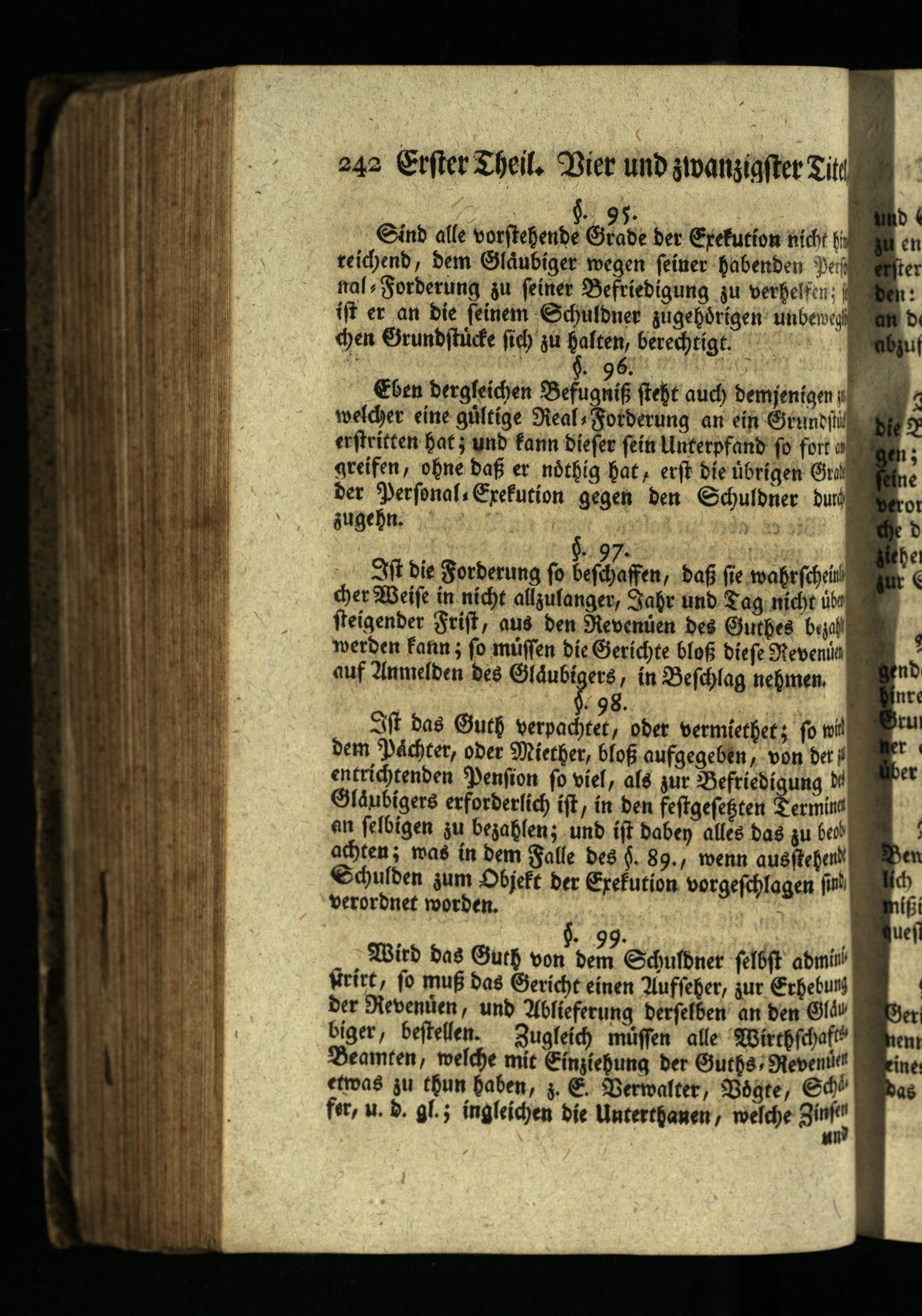 Sind alle vorstehende Grade der Exekution nicht hin reichend, dem Gläubiger wegen seiner habenden Per nal Forderung zu seiner Befriedigung zu verhelfen; ist er an die seinem Schuldner zugehörigen unbewegh chen Grundstücke sich zu halten, berechtigt.