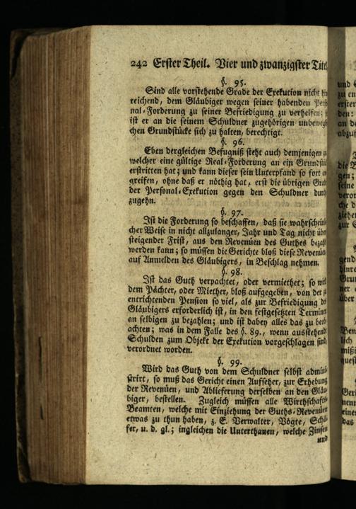 Wird das Guth von dem Schuldner selbst admini Strirt, so muß das Gericht einen Aufseher, zur Erhebung der Revenuen, und Ablieferung derselben an den Glau biger, bestellen. Zugleich müssen alle Wirthschafts Beamten, welche mit Einziehung der Guths Revenue etwas zu thun haben, z. E. Verwalter, Bögte, Schä fer, u. 5. gl.; ingleichen die Unterthanen, welche Zinsen