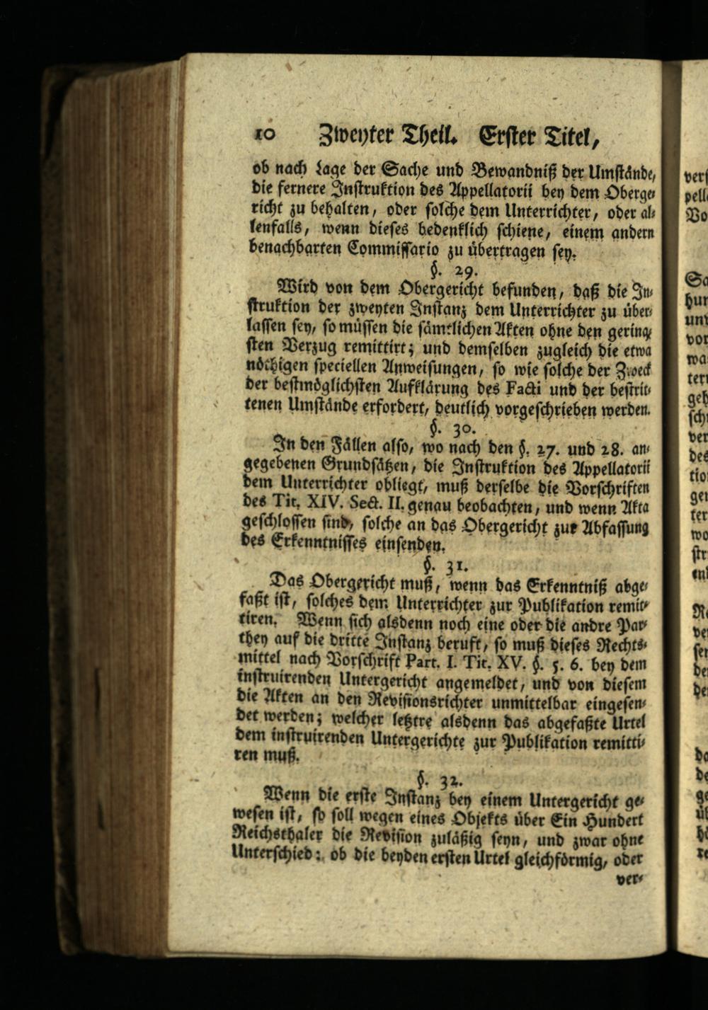 Wird von dem Obergericht befunden, daß die Ins struktion der zweyten Instanz dem Unterrichter zu über laffen sey, so müssen die sämtlichen Akten ohne den gering ften Verzug remittirt; und demselben zugleich die etwa ndthigen speciellen Anweisungen, so wie solche der Zweck ber bestmöglichsten Aufklärung des Facti und der bestrit tenen Umstände erfordert, deutlich vorgeschrieben werden. §. 30.