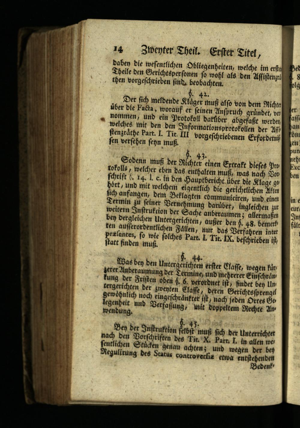 Sodenn muß der Richter einen Extrakt dieses Pro tokolls, welcher eben das enthalten muß, was nach Boo schrift f. 14. 1. c. in den Hauptbericht über die Klage ge hört, und mit welchem eigentlich die gerichtlichen Akten sich anfangen, dem Beklagten communiciren, und einen Termin zu seiner Vernehmung darüber, ingleichen zur weitern Instruktion der Sache anberaumen; allermaßen ben dergleichen Untergerichten, außer den§. 48. bemerk ten aufferordentlichen Fällen, nur das Verfahren inter præfentes, fo wie solches Part. I. Tit. IX. beschrieben ist, statt finden muß.