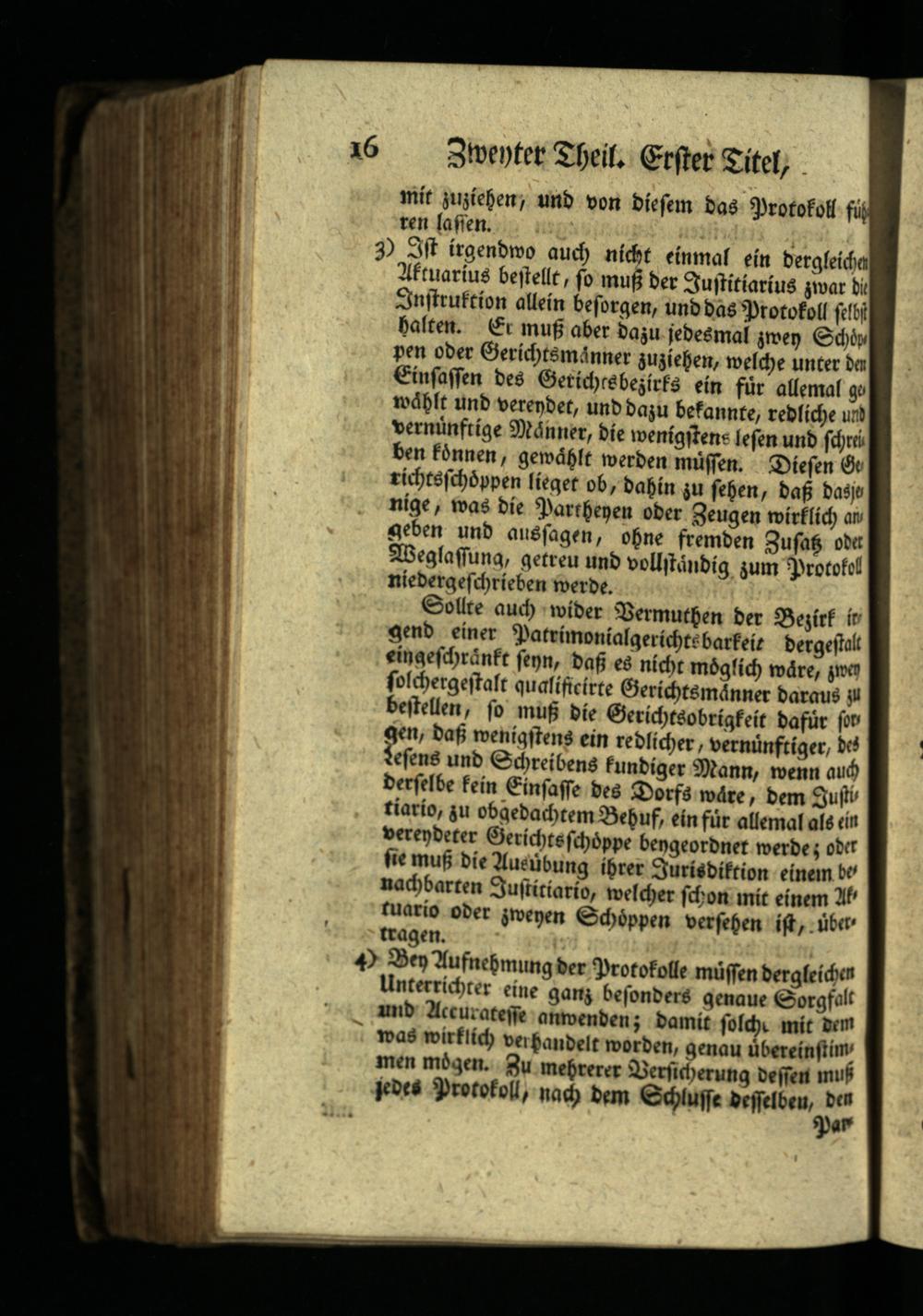 3) Ist irgendwo auch nicht einmal ein dergleichen Aktuarius bestellt, so muß der Justitiarius zwar die Instruktion allein besorgen, und das Protokoll felb halten. Er muß aber dazu jedesmal zwen Schöp A pen oder Gerichtsmanner zuziehen, welche unter den Einfassen des Gerichtsbezirks ein für allemal go wählt und verendet, und dazu bekannte, redliche und Avernünftige Männer, die wenigstens lesen und schrei