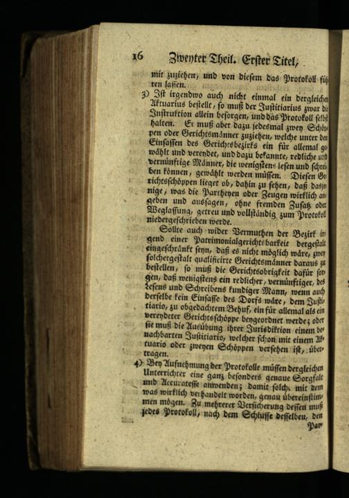 Sollte auch wider Vermuthen der Bezirk in gend einer Patrimonialgerichtsbarkeit dergestalt eingeschränkt seyn, daß es nicht möglich wäre, zwey folchergestalt qualificirte Gerichtsmänner daraus zu bestellen, so muß die Gerichtsobrigkeit dafür for gen, daß wenigstens ein redlicher, vernünftiger, des Lesens und Schreibens fundiger Mann, wenn auch derselbe kein Einfasse des Dorfs wäre, dem Justi tiario, zu obgedachtem Behuf, ein für allemal als ein verendeter Gerichtsschoppe bengeordnet werde; oder fie muß die Ausübung ihrer Jurisdiktion einem be nachbarten Justitiario, welcher schon mit einem Af tuario oder zweyen Schöppen versehen ist, über tragen. 4) Ben Aufnehmung der Protokolle müssen dergleichen Unterrichter eine ganz besonders genaue Sorgfalt and Accuratesse anwenden; damit solche mit dem was wirklich verhandelt worden, genau übereinstim men mögen. Zu mehrerer Versicherung dessen muß jedes Protokoll, nach dem Schlusse desselben, den