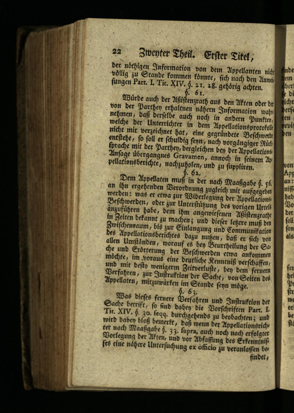 Was dieses fernere Verfahren und Instruktion der Sache betrift, so find daben die Vorschriften Part. I. Tit. XIV.§. 30. feqq. durchgehends zu beobachten; und wird daben bloß bemerkt, daß wenn der Appellationsrich ter nach Maaßgabe§. 33. fupra, auch noch nach erfolgter Borlegung der Aften, und vor Abfassung des Erkenntnis fes eine nähere Untersuchung ex officio zu veranlassen bes