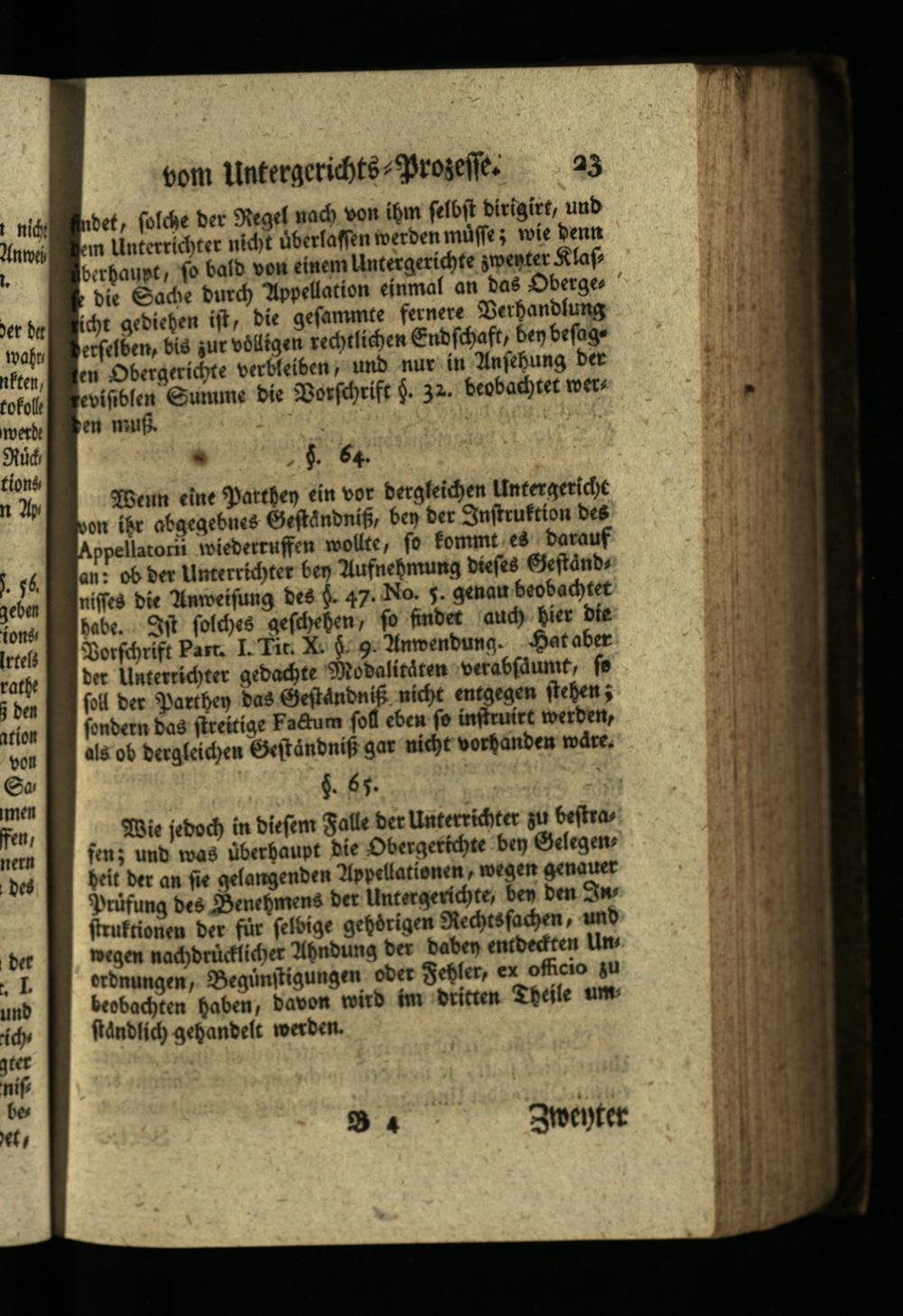 Wie jedoch in diesem Falle der Unterrichter zu bestra fen; und was überhaupt die Obergerichte ben Gelegen heit der an fie gelangenden Appellationen, wegen genauer Prüfung des Benehmens der Untergerichte, ben den In struktionen der für selbige gehörigen Rechtsfachen, und wegen nachdrücklicher Ahndung der daben entdeckten Uns ordnungen, Begünstigungen oder Fehler, ex officio zu beobachten haben, davon wird im dritten Theile um standlich gehandelt werden.