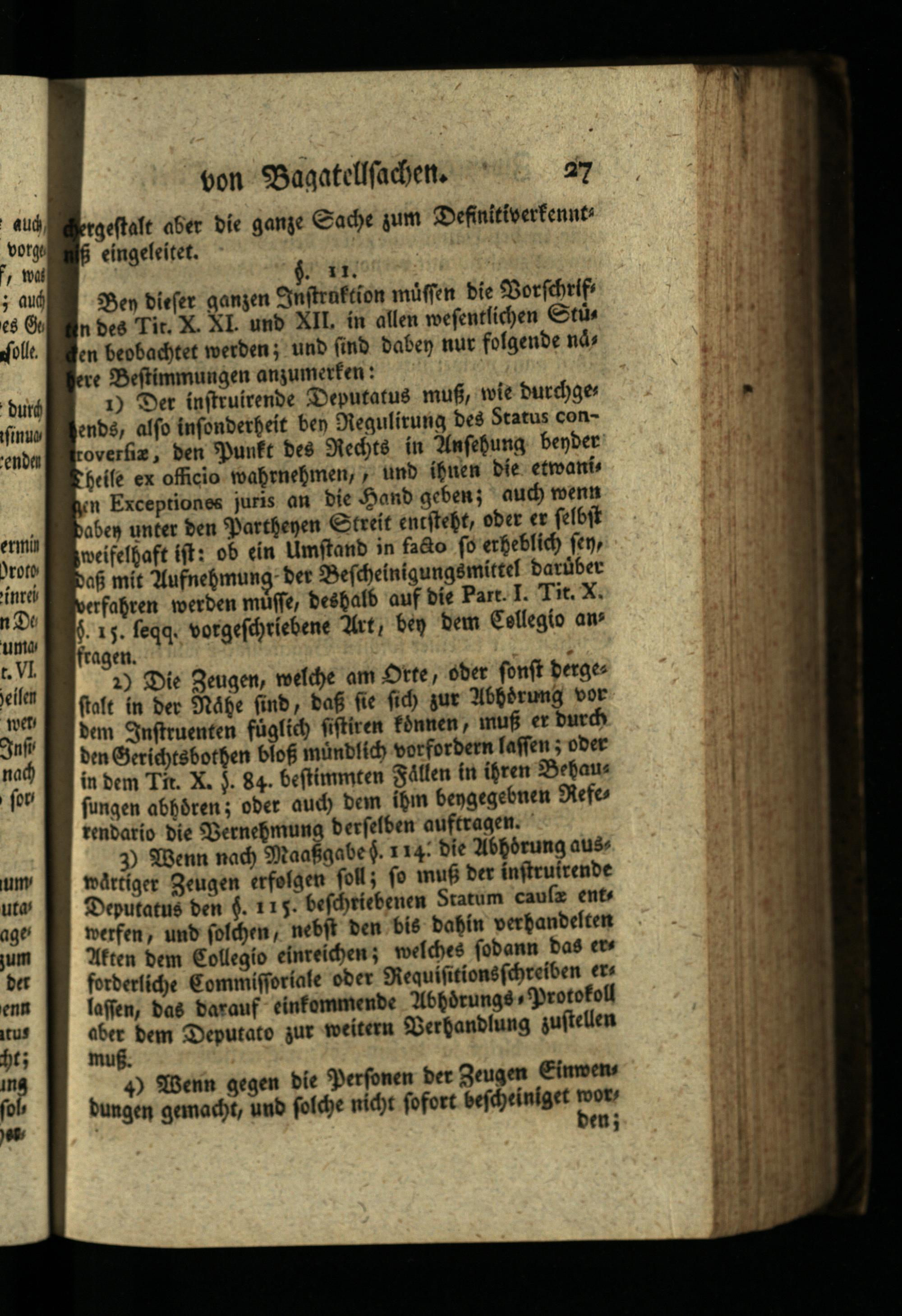 durd 1) Der instruirende Deputatus muß, wie durchges finua ends, also insonderheit bey Regulirung des Status concenden troverfiæ, den Punkt des Rechts in Ansehung bender Theile ex officio wahrnehmen ,, und ihnen die etwanis gen Exceptiones juris an die Hand geben; auch wenn baben unter den Partheyen Streit entsteht, oder er selbst zweifelhaft ist: ob ein Umstand in facto so erheblich sen, Daß mit Aufnehmung der Bescheinigungsmittel darüber verfahren werden müsse, deshalb auf die Part. I. Tit. X. 6. 15. feqq. vorgeschriebene Art, bey dem Collegio an fragen.