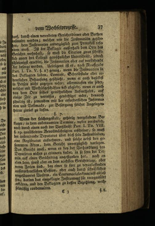 barf, durch einen verendeten Gerichtsdiener oder Bothen infinuirt werden; welcher wie die Insinuation gesches hen, dem Instruenten unverzüglich zum Protokoll refes ziren muß. Ist der Beklagte ausserhalb dem Orte des Gerichts wohnhaft, so muß die Citation zwar schrifts lich unter des Collegii gewöhnlicher Unterschrift, jedoch schleunigst expedirt, die Insinuation aber auf vorstehende Art besorgt werden. Uebrigens ist es, nach Maaßgabe Part. I. Tit. V.§. 17.genug, wenn die Insinuation in des Beklagten Laden, Comtoir, Schreibstube oder or dentlichen Behausung geschieht, wenn er auch daselbst in Verfon nicht zugegen wåre; allermaaßen ein jeder, welcher mit Wechselgeschäften sich abgiebt, wenn er auc von dem Orte seines gewöhnlichen Aufenthalts, auf einige Zeit zu verreisen, genöthiget wäre, dennoch schuldig ist, jemanden mit der erforderlichen Informas tion und Vollmacht, zur Besorgung solcher Angelegens heiten zurück zu lassen.