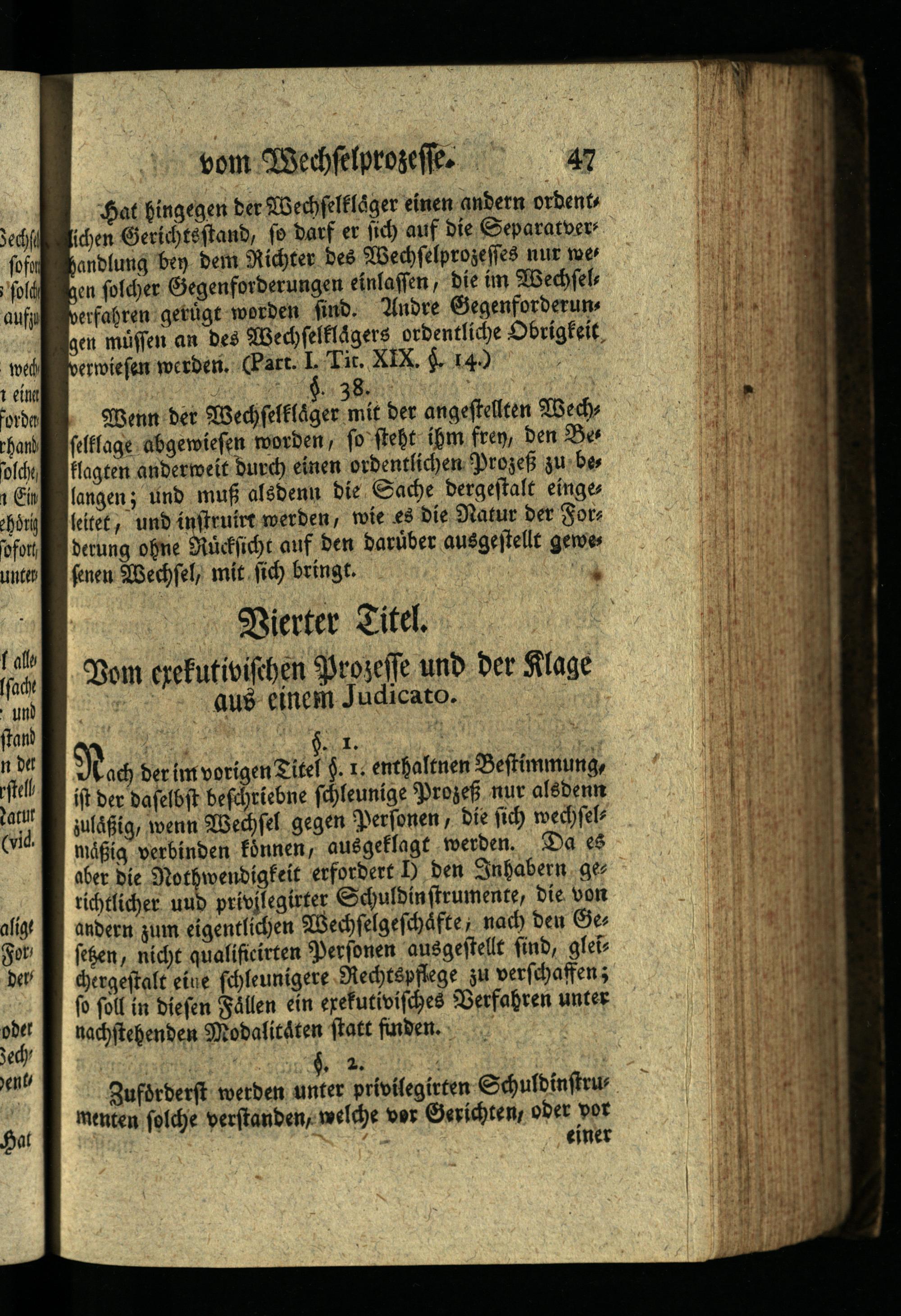 ist der daselbst beschriebne schleunige Prozeß nur alsdenn zuläßig, wenn Wechsel gegen Personen, die sich wechselmäßig verbinden können, ausgeflagt werden. Da es aber die Nothwendigkeit erfordert I) den Inhabern ges richtlicher und privilegirter Schuldinstrumente, die von andern zum eigentlichen Wechselgeschäfte, nach den Ges sezen, nicht qualificirten Personen ausgestellt sind, glei chergestalt eine schleunigere Rechtspflege zu verschaffen; so soll in diesen Fällen ein exekutivisches Verfahren unter nachstehenden Modalitäten statt finden.