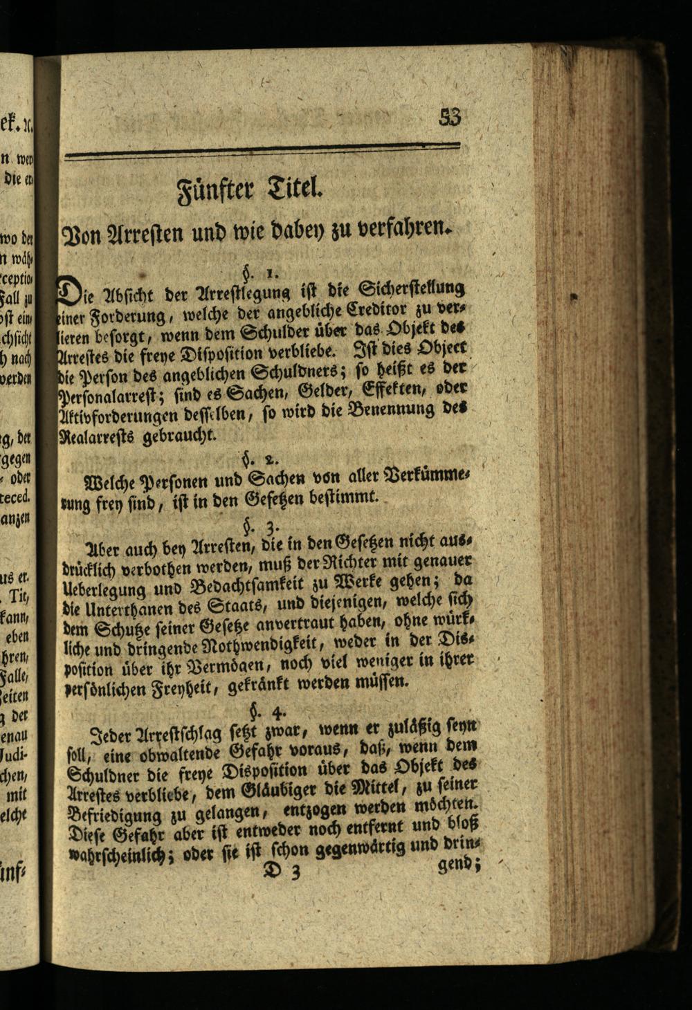 Uber auch bey Arresten, die in den Gesezen nicht auss drücklich verbothen werden, muß der Richter mit genauer Ueberlegung und Bedachtsamkeit zu Werke gehen; da die Unterthanen des Staats, und diejenigen, welche sich dem Schuße seiner Geseze anvertraut haben, ohne würk. liche und dringende Nothwendigkeit, weder in der Diss position über ihr Vermögen, noch viel weniger in ihrer persönlichen Freyheit, gekränkt werden müssen.