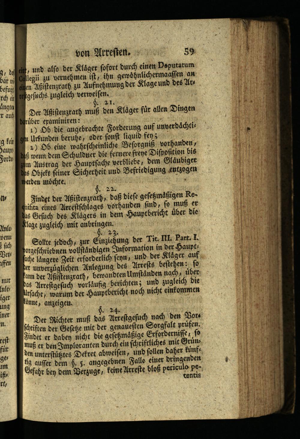 Der Richter muß das Arrestgesuch nach den Vors schriften der Gesetze mit der genauesten Sorgfalt prüfen. Findet er daben nicht die gesetzmäßige Erfordernisse, so muß er den Imploranten durch ein schriftliches mit Gründen unterstüßtes Dekret abweisen, und sollen daher künftig auffer dem§. 5. angegebnen Falle einer dringenden Gefahr bey dem Verzuge, feine Arreste bloß periculo pe
