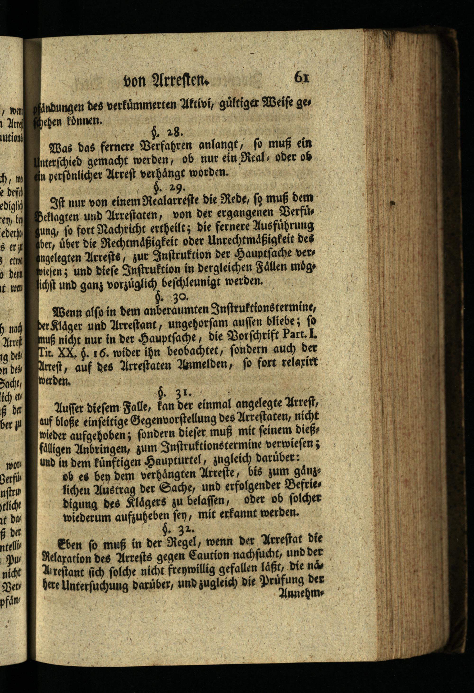 Ist nur von einem Realarreste die Rede, so muß dem Beklagten und Arrestaten, von der ergangenen Verfü sung, so fort Nachricht ertheilt; die fernere Ausführung s er aber, über die Rechtmäßigkeit oder Unrechtmäßigkeit des angelegten Arrests, zur Instruktion der Hauptsache vers wiesen; und diese Instruktion in dergleichen Fällen mög lichst und ganz vorzüglich beschleunigt werden. §. 30.