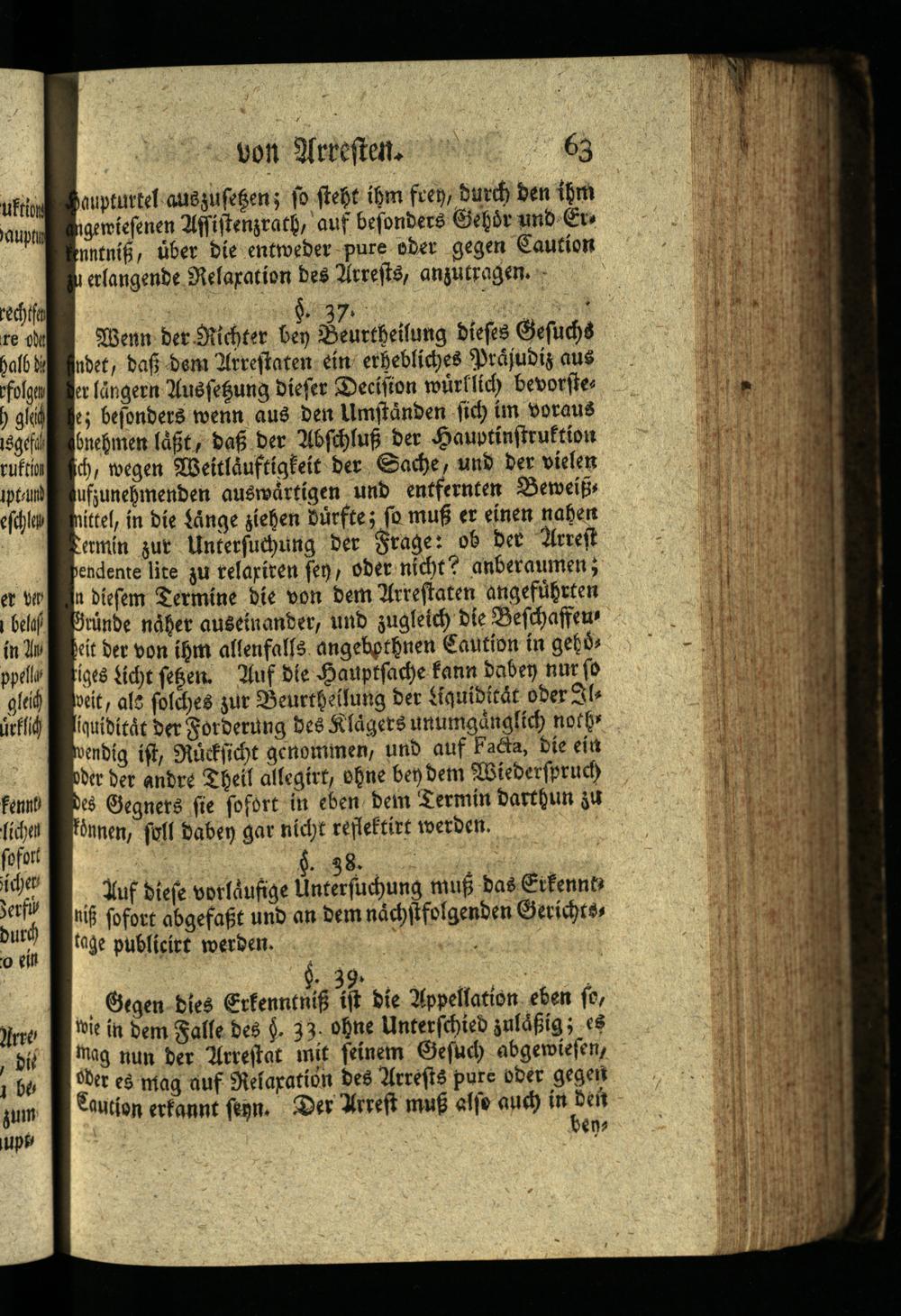 uftions Haupturtel auszusetzen; so steht ihm frey, durch den ihm angewiesenen Assistenzrath, auf besonders Gehör und Er kenntniß, über die entweder pure oder gegen Caution zu erlangende Relaxation des Arrests, anzutragen.