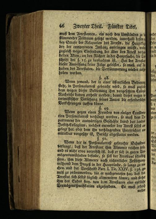 Wenn der in Personalarrest gebrachte Schuldner verlangt, daß der Arrestant ihm Alimente reichen solle, und es nicht etwa notorisch ist, daß er sich in guten Vers mögensumständen befinde, so soll der Arrestant schuldig seyn, ihm diese Alimente nach richterlicher Festsetzung während dem Prozeß in der Hauptsache, so lange zu rei chen, und der Vorschrift Part. I. Tit. XXIV.§. 136. ge måß zu pränumeriren, bis er nachgewiesen hat, daß der Arrestat fich selbst füglich alimentiren könne; und stehet ihm des Endes fren, von dem Arrestaten eine endliche Vermogensspecifikation abzufordern. Es muß jedoch