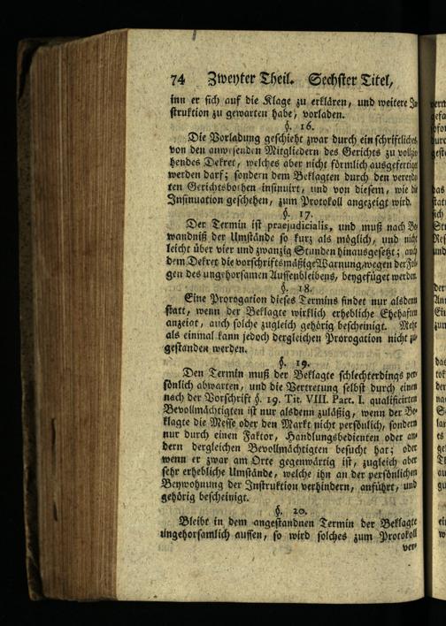 Der Termin ist praejudicialis, und muß nach Be wandniß der Umstände so furz als möglich, und nicht leicht über vier und zwanzig Stunden hinausgesetzt; aud dem Dekret die vorschriftsmäßige Warnung, wegen der Fol gen des ungehorsamen Aussenbleibens, bengefüget werden. §. 18.