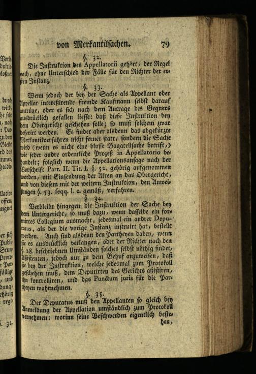 Wenn jedoch der bey der Sache als Appellant oder Appellat intereßirende fremde Kaufmann selbst darauf antrüge, oder es sich nach dem Antrage des Gegners he fet ausdrücklich gefallen lieffe: daß diefe Instruktion bey dem Obergericht geschehen solle; so muß solchem zwar deferirt werden. Es findet aber alsdenn das abgekürzte Merkantilverfahren nicht ferner statt, sondern die Sache. wird( wenn es nicht eine blosse Bagatellfache betrift,> wie jeder andre ordentliche Prozeß in Appellatorio bes handelt; folglich wenn die Appellationsansage nach der Vorschrift Part. II. Tit. I.§. 52. gehörig aufgenommen worden, mit Einsendung der Akten an das Obergericht, und von diesem mit der weitern Instruktion, den Anweis fungen§. 53. feqq. 1. c. gemäß, verfahren. §. 34.