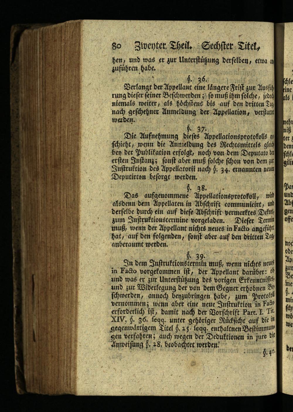 In dem Instruktionstermin muß, wenn nichts neues in Facto vorgekommen ist, der Appellant darüber: ob und was er zur Unterstüßung des vorigen Erkenntnisses und zur Widerlegung der von dem Gegner erhobnen Be schwerden, annoch benzubringen habe, zum Protokoll vernommen; wenn aber eine neue Instruktion in Fado erforderlich ist, damit nach der Vorschrift Part. I. Tit. XIV,§. 36. feqq. unter gehöriger Rücksicht auf die in gegenwärtigem Titel§. 25. feqq. enthaltnen Bestimmun gen verfahren; auch wegen der Deduktionen in jure bie Anweisung§. 28, beobachtet werden.