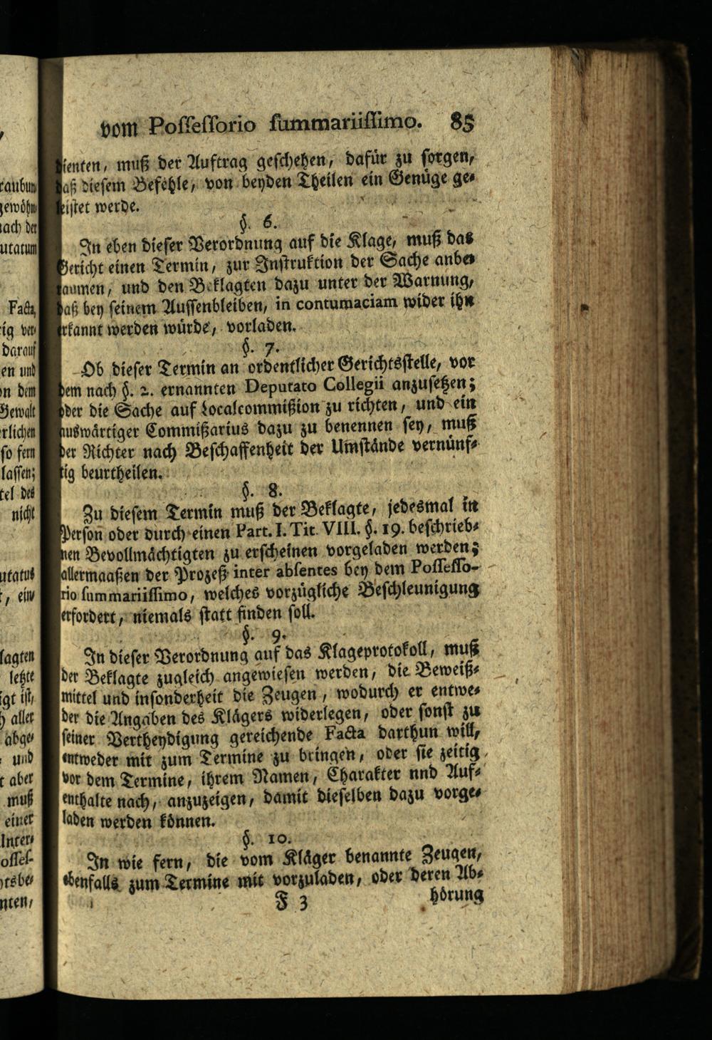 Zu diesem Termin muß der Beklagte, jedesmal in Person oder durch einen Part. I. Tit. VIII.§. 19. beschriebe nen Bevollmächtigten zu erscheinen vorgeladen werden; utatus allermaaßen der Prozeß inter abfentes ben dem Poffefforio fummariiffimo, welches vorzügliche Beschleunigung erfordert, niemals statt finden soll.