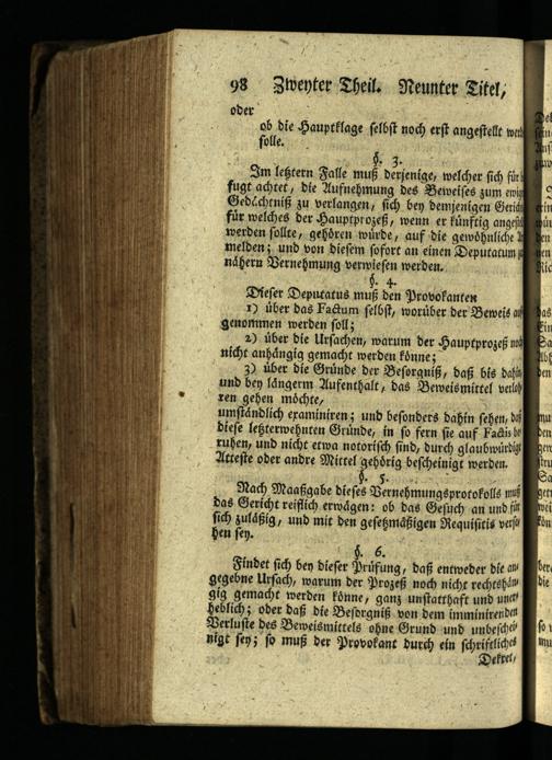Im letztern Falle muß derjenige, welcher sich für fugt achtet, die Aufnehmung des Beweises zum ewig Gedächtniß zu verlangen, sich bey demjenigen Gericht für welches der Hauptprozeß, wenn er fünftig angest werden sollte, gehören würde, auf die gewöhnliche melden; und von diesem sofort an einen Deputatum nähern Vernehmung verwiesen werden.