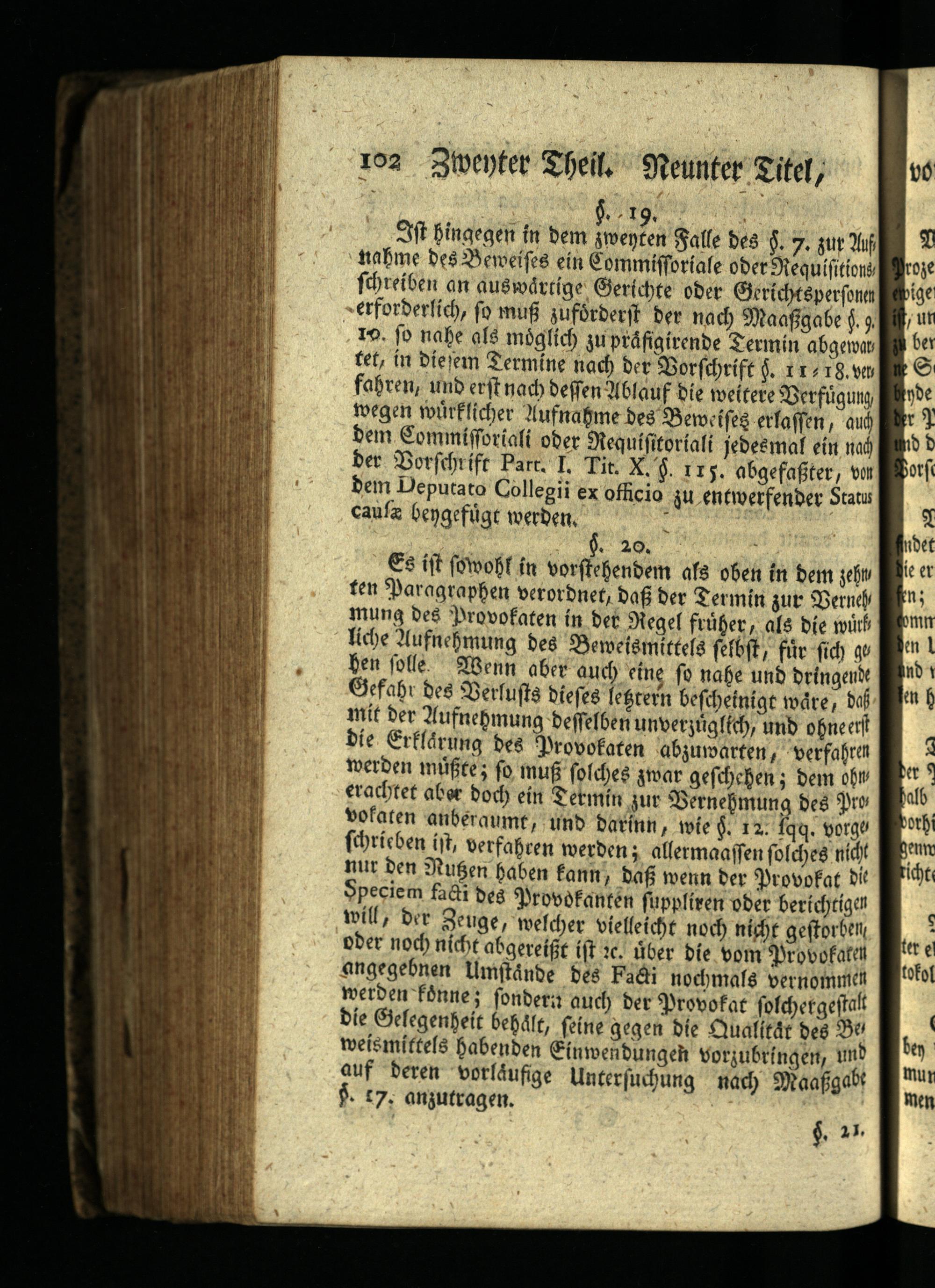 Ist hingegen in dem zweyten Falle des§. 7. zur Auf nahme des Beweises ein Commifforiale oder Requisitions Proze schreiben an auswärtige Gerichte oder Gerichtspersonen ewige erforderlich, so muß zuförderst der nach Maaßgabe§. 9. it un 10. so nahe als möglich zu präfigirende Termin abgewar ber tet, in diesem Termine nach der Vorschrift§. 11-18. versne S fahren, und erst nach dessen Ablauf die weitere Verfügung, bende wegen würklicher Aufnahme des Beweises erlassen, auch der dem Commissoriali oder Requisitoriali jedesmal ein nach und d der Vorschrift Part. I. Tit. X.§. 115. abgefaßter, von Bors Dem Deputato Collegii ex officio zu entwerfender Status caufa bengefügt werden.