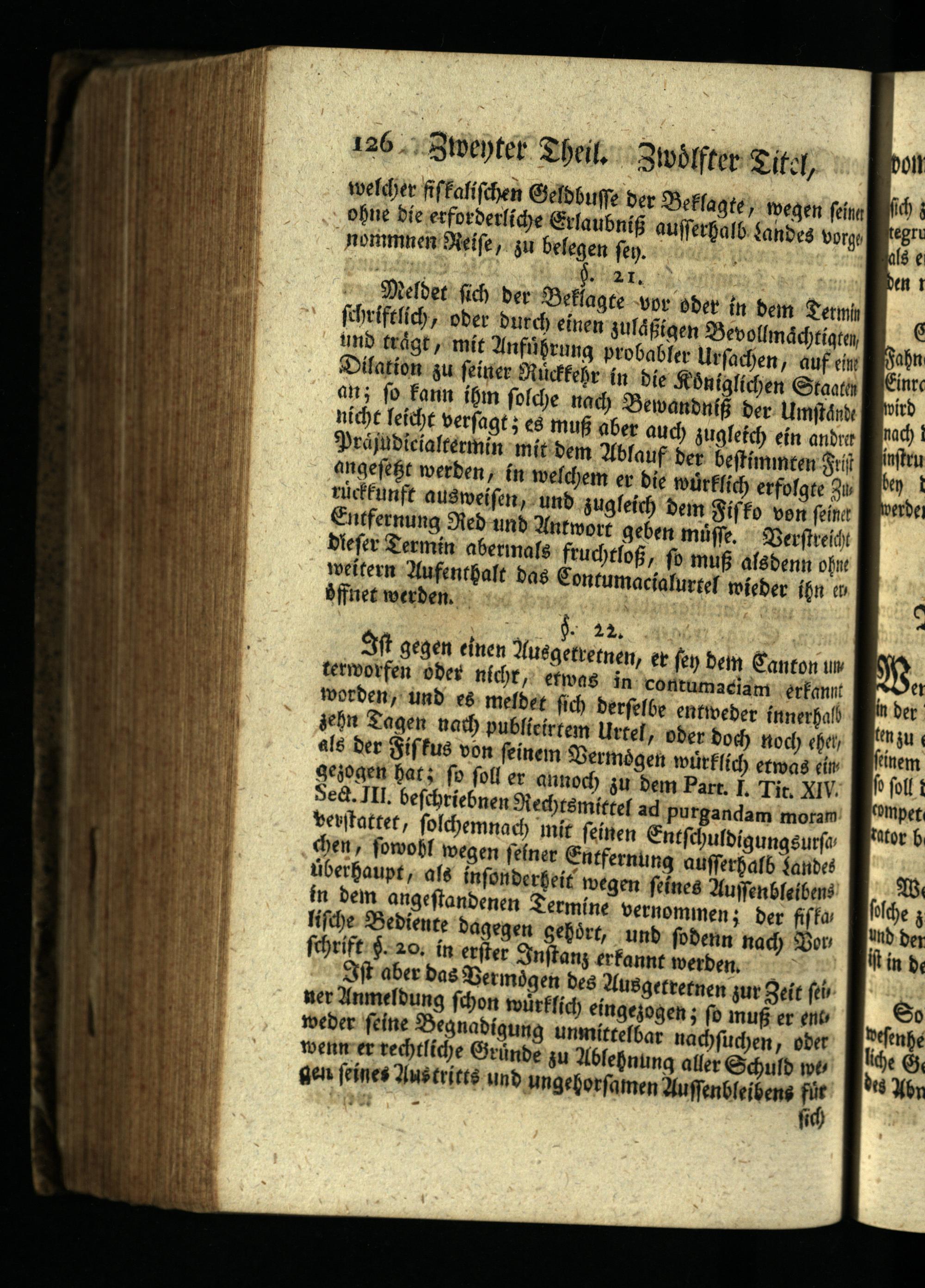 126 Zweyter Theil. Zwölfter Titel, me welcher fiskalischen Geldbusse der Beklagte, wegen seine ohne die erforderliche Erlaubniß ausserhalb Landes vorge nommnen Reise, zu belegen sey.