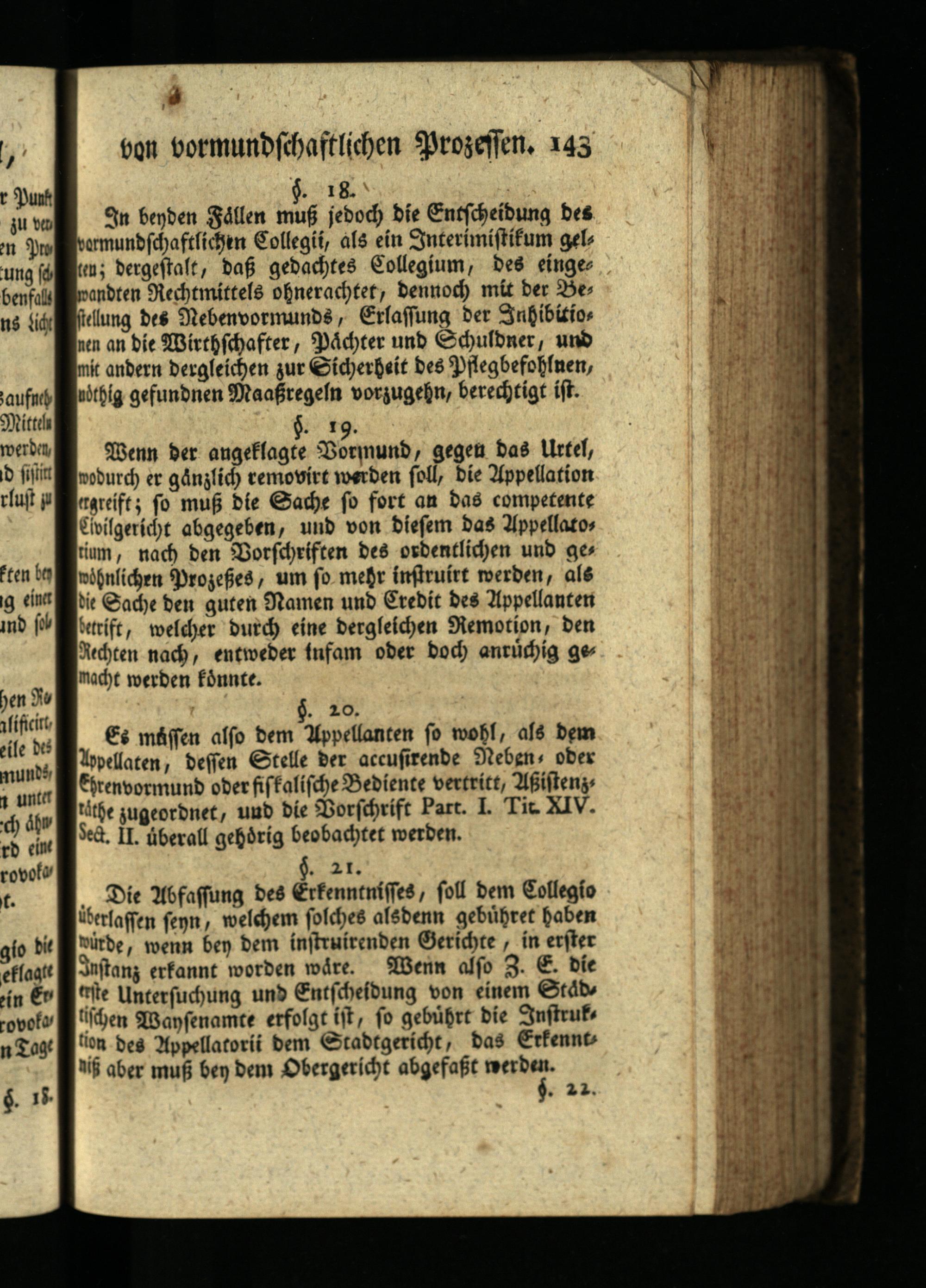 Es mássen also dem Appellanten so wohl, als dem Appellaten, deffen Stelle der accufirende Neben oder Ehrenvormund oder fiskalische Bediente vertritt, Aßistenzráthe zugeordnet, und die Vorschrift Part. I. Tit. XIV. Seat. II. überall gehörig beobachtet werden. §. 21.