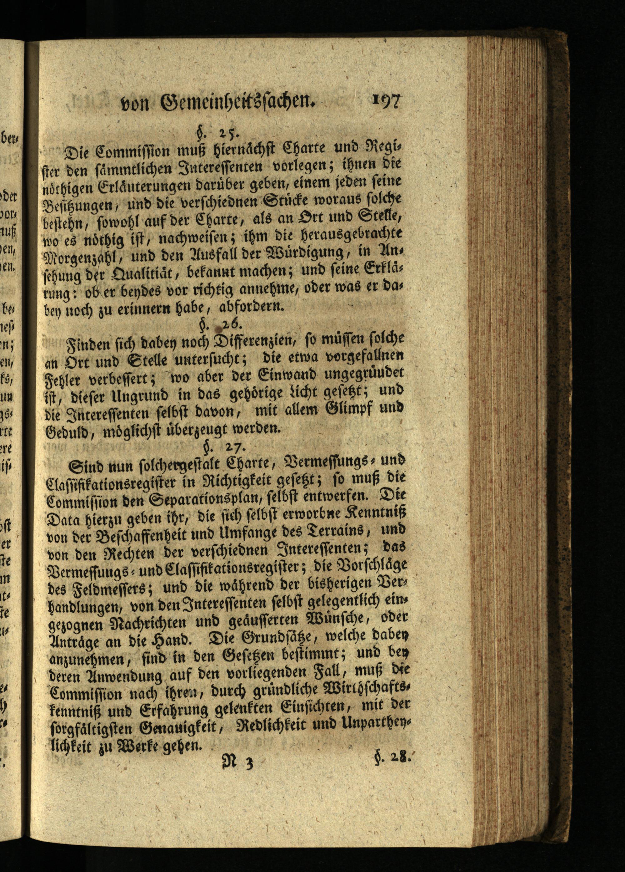 Sind nun solchergestalt Charte, Vermessungs- und Classifikationsregister in Richtigkeit gefeßt; so muß die Commission den Separationsplan, selbst entwerfen. Die Data hierzu geben ihr, die sich selbst erworbne Kenntniß von der Beschaffenheit und Umfange des Terrains, und von den Rechten der verschiednen Interessenten; das Bermeffungs und Classifikationsregister; die Vorschläge des Feldmessers; und die während der bisherigen Bers handlungen, von den Interessenten selbst gelegentlich eins gezognen Nachrichten und geäufferten Wünsche, oder Anträge an die Hand. Die Grundsäße, welche daben anzunehmen, find in den Gesetzen bestimmt; und ben deren Anwendung auf den vorliegenden Fall, muß die Commission nach ihren, durch gründliche Wirthschafts kenntniß und Erfahrung gelenkten Einsichten, mit der forgfältigsten Genauigkeit, Redlichkeit und Unparthen lichkeit zu Werke gehen. §. 28.