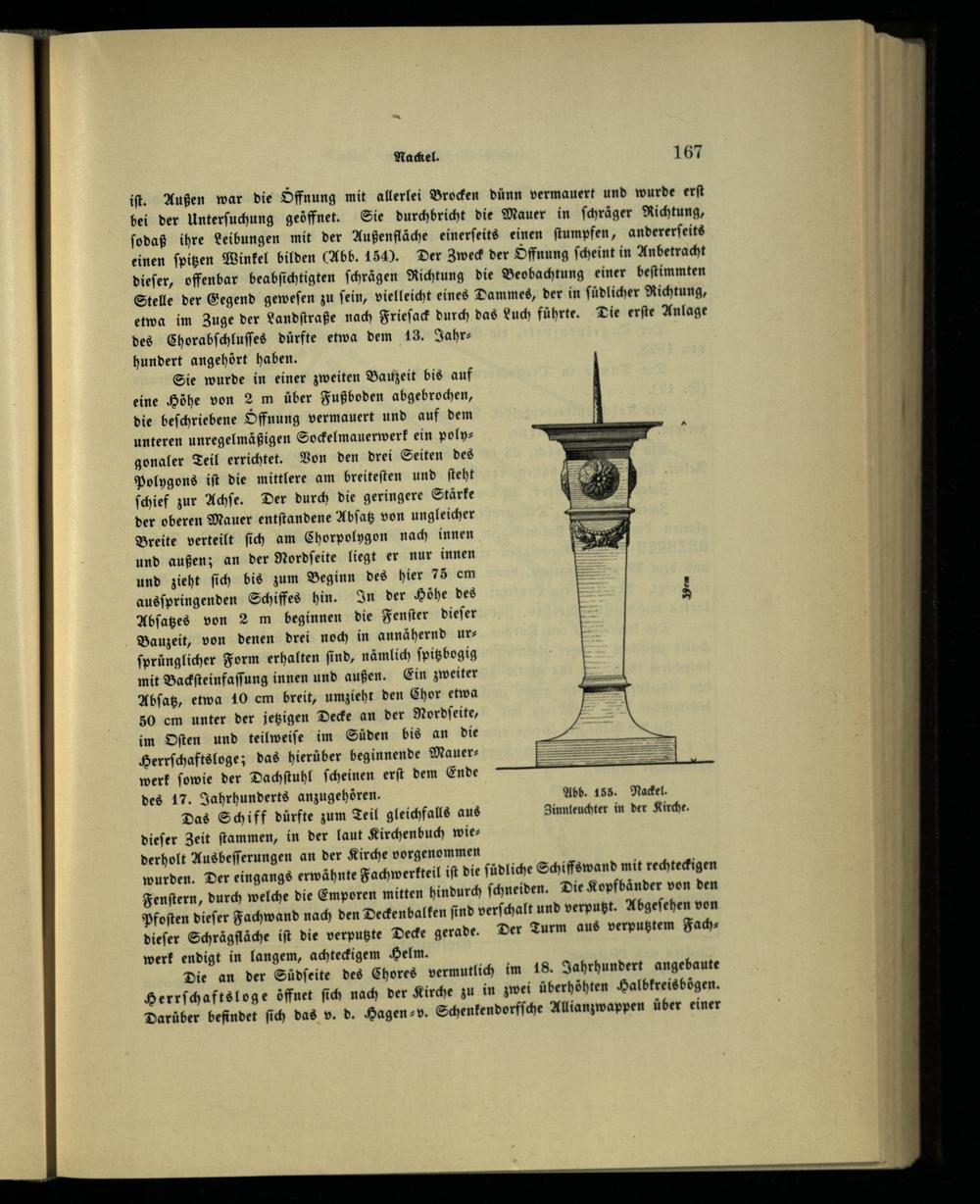 Sie wurde in einer zweiten Bauzeit bis auf eine Höhe von 2 m über Fußboden abgebrochen, die beſchriebene Offnung vermauert und auf dem unteren unregelmäßigen Sockelmauerwerk ein polygonaler Teil errichtet. Von den drei Seiten des Polygons iſt die mittlere am breiteſten und ſteht ſchief zur Achſe. Der durch die geringere Stärke der oberen Mauer entſtandene Abſatz von ungleicher Breite verteilt ſich am Chorpolygon nach innen und außen; an der Nordſeite liegt er nur innen und zieht ſich bis zum Beginn des hier 75 em ausſpringenden Schiffes hin. In der Höhe des Abſatzes von 2 m beginnen die Fenſter dieſer Bauzeit, von denen drei noch in annähernd urſprünglicher Form erhalten ſind, nämlich ſpitzbogig mit Backſteinfaſſung innen und außen. Ein zweiter Abſatz, etwa 10 em breit, umzieht den Chor etwa 50 em unter der jetzigen Decke an der Nordſeite, im Oſten und teilweiſe im Süden bis an die Herrſchaftsloge; das hierüber beginnende Mauerwerk ſowie der Dachſtuhl ſcheinen erſt dem Ende des 17. Jahrhunderts anzugehören. Abb. 155. Nackel.