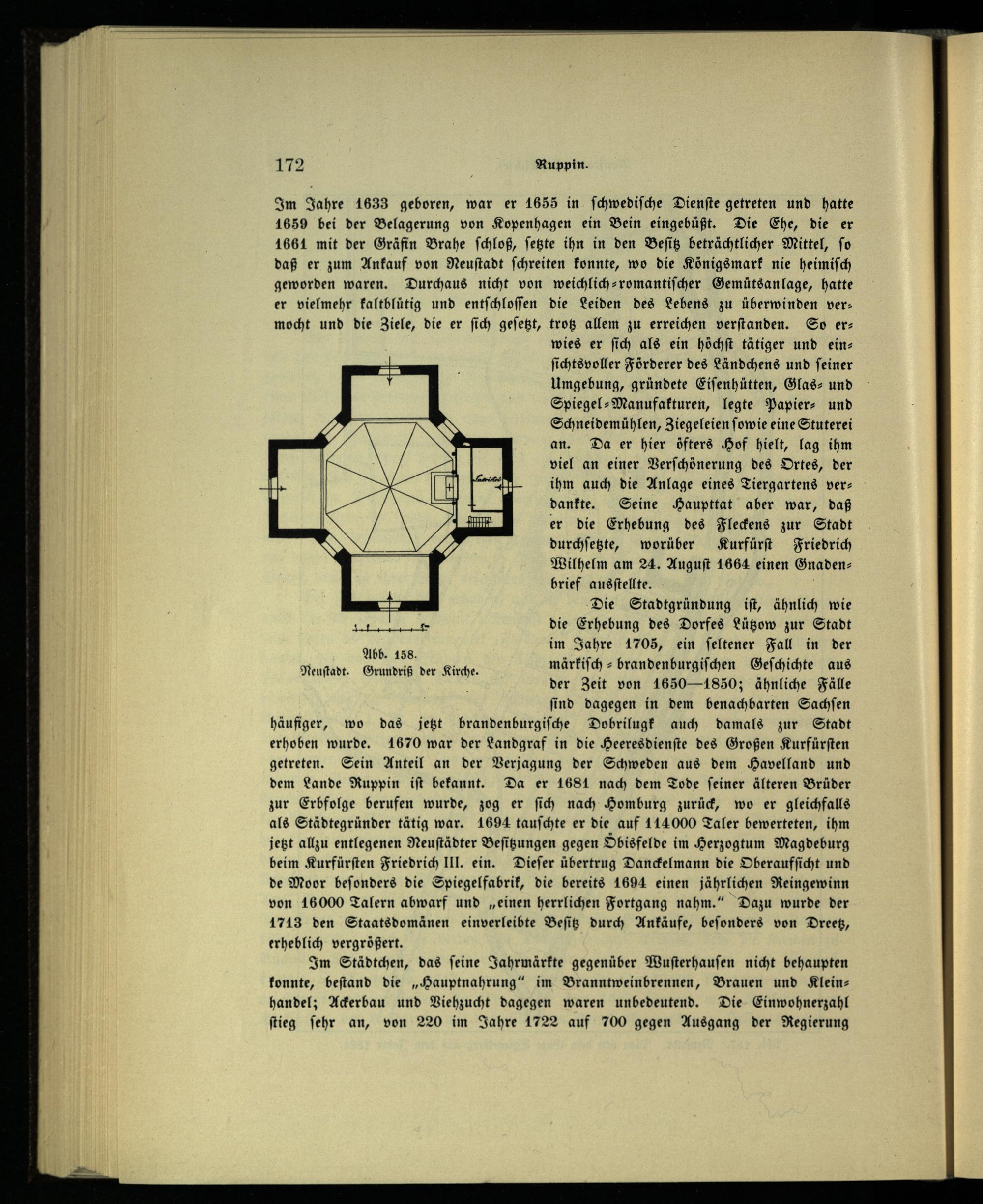 Im Städtchen, das ſeine Jahrmärkte gegenüber Wuſterhauſen nicht behaupten konnte, beſtand die„Hauptnahrung“ im Branntweinbrennen, Brauen und Kleinhandel; Ackerbau und Viehzucht dagegen waren unbedeutend. Die Einwohnerzahl ſtieg ſehr an, von 220 im Jahre 1722 auf 700 gegen Ausgang der Regierung