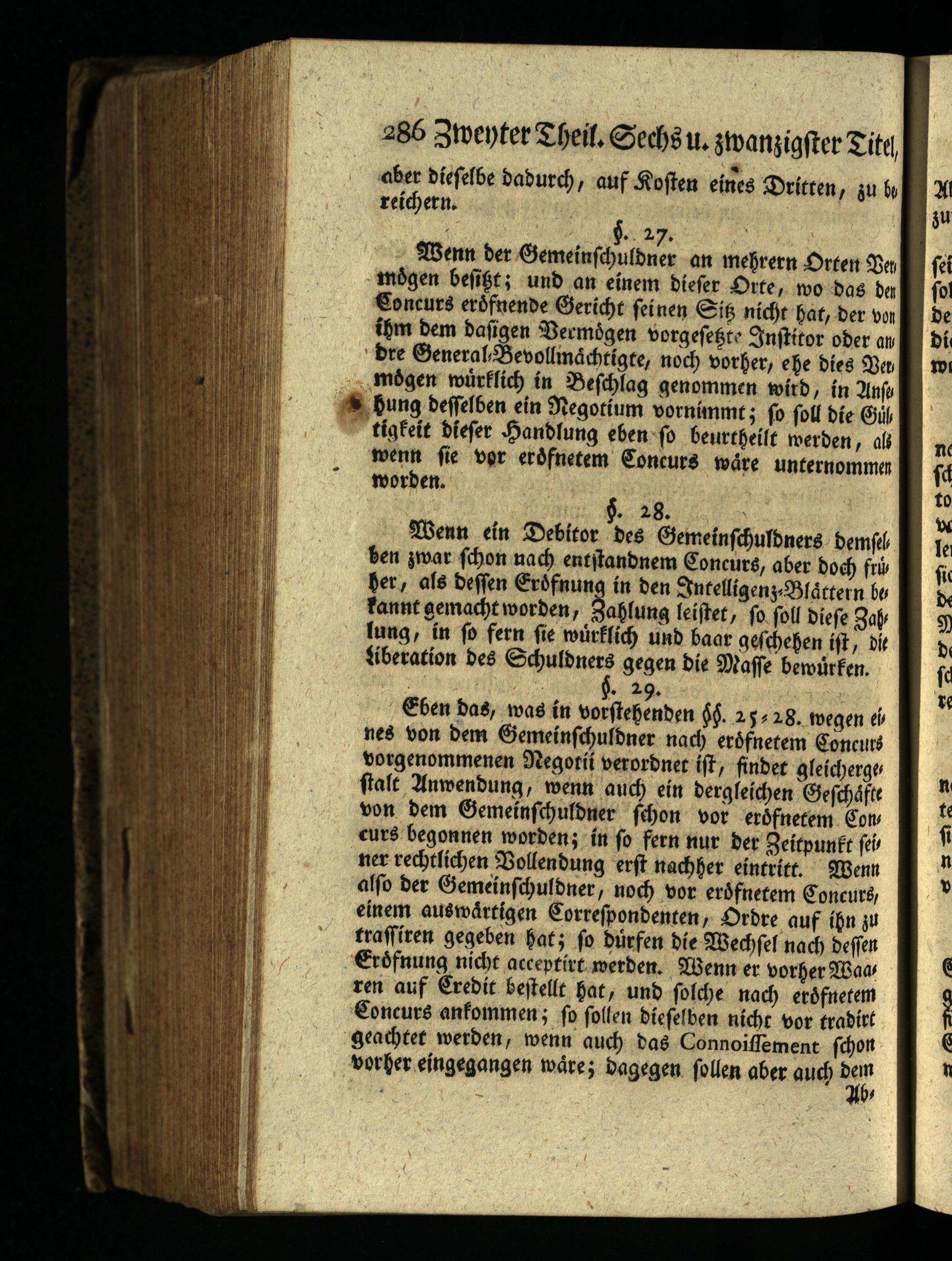 Wenn ein Debitor des Gemeinschuldners demsel ben zwar schon nach entstandnem Concurs, aber doch frü her, als dessen Erdfnung in den Intelligenz- Blättern be fannt gemacht worden, Zahlung leistet, so soll diese Zah lung, in so fern sie würklich und baar geschehen ist, die Siberation des Schuldners gegen die Masse bewürfen. §. 29.