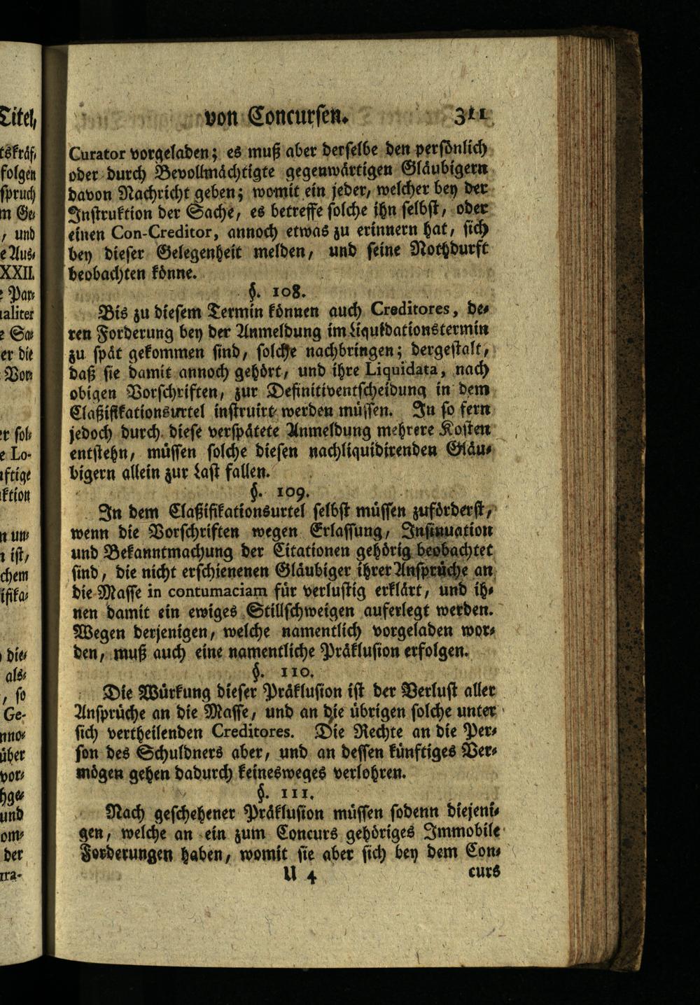 In dem Claßifikationsurtel selbst müssen zufördert, wenn die Vorschriften wegen Erlassung, Insinuation und Bekanntmachung der Citationen gehörig beobachtet sind, die nicht erschienenen Gläubiger ihrer Ansprüche an die Masse in contumaciam für verlustig erklärt, und ih, nen damit ein ewiges Stillschweigen auferlegt werden. Wegen derjenigen, welche namentlich vorgeladen wors den, muß auch eine namentliche Präklusion erfolgen. §. 110.